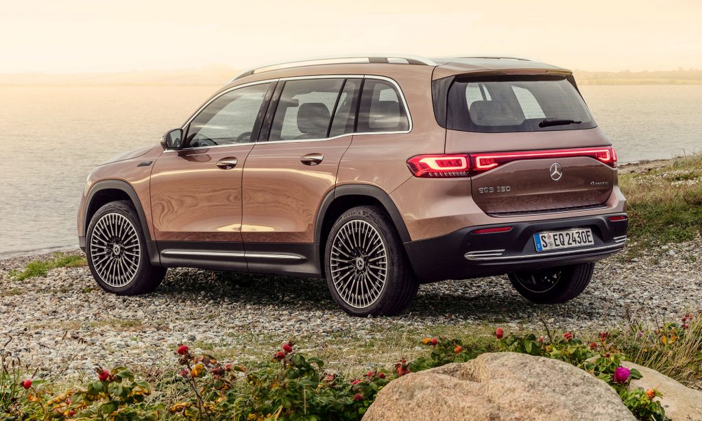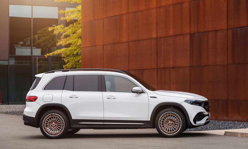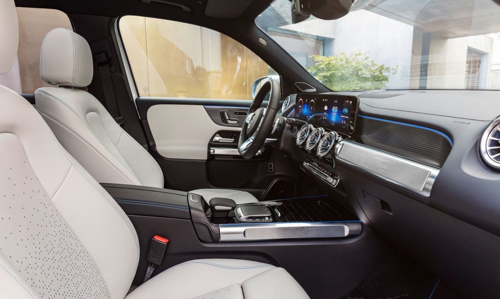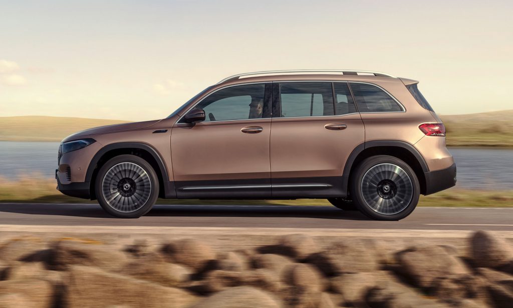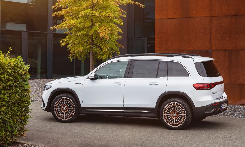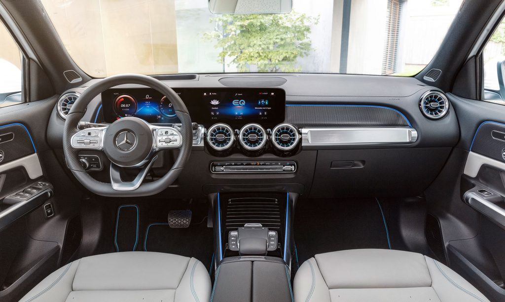 valamint a 20 colos, sokküllős kerekek stílusa ismerős lehet a kisebb testvéréről, az EQA-ról, amihez képest a szélvédő és az oldalablakok meredekebben állnak, ezért kivételesen nagy a fejtér és zavartalan a kilátás. Az alakja valamivel áramvonalasabb lett a GLB-nél, a Cw értéke 0,28.