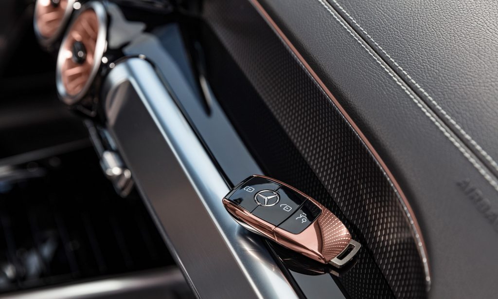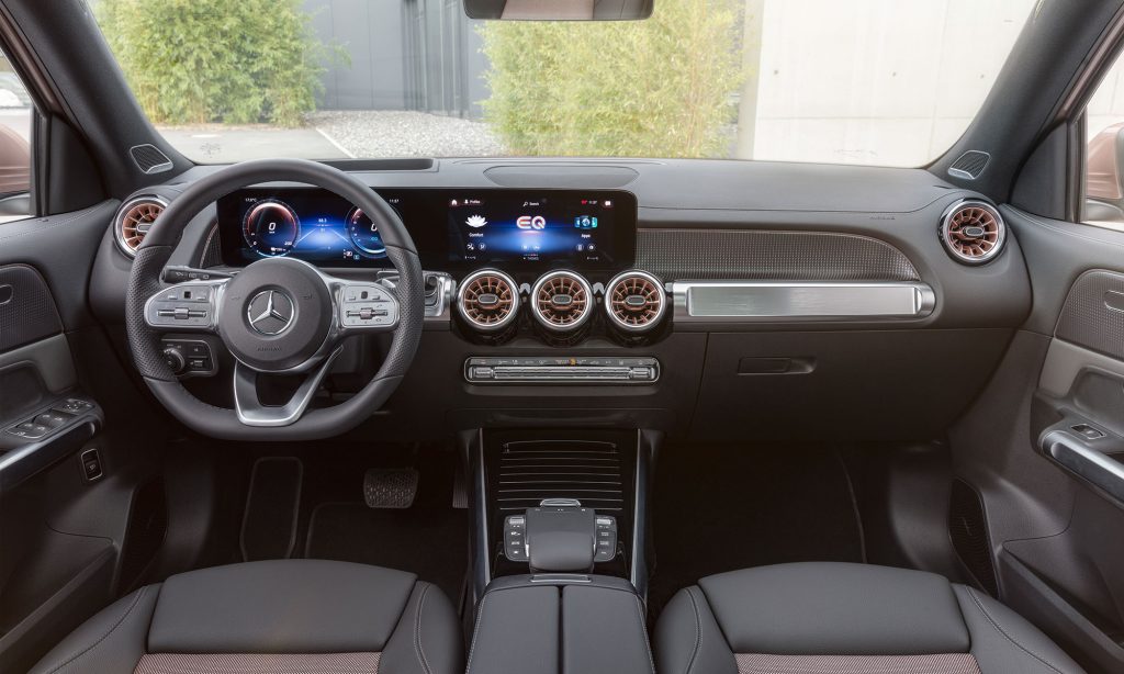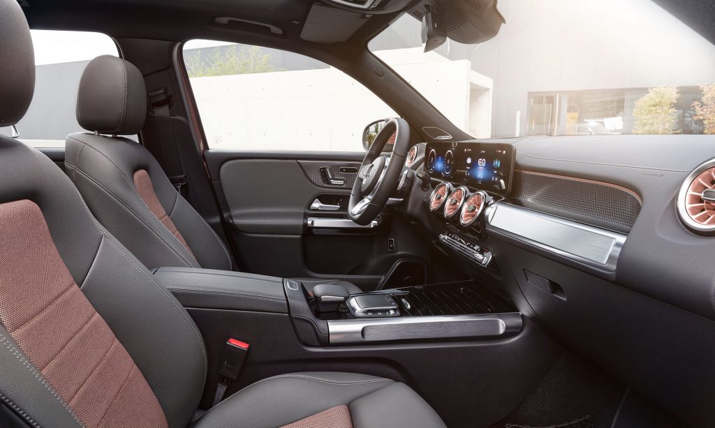 A belső tér szinte változatlanul került át a GLB-ből, a különbséget a rozéarany színű részletek jelenik, az autó távirányítója is ebben a színben pompázik.