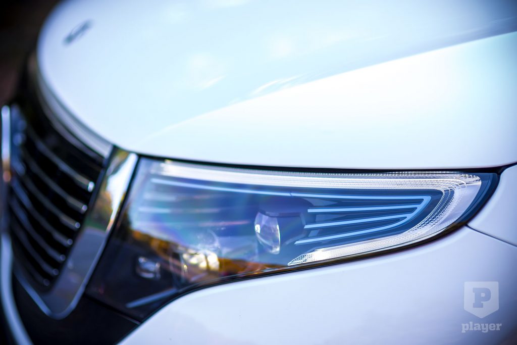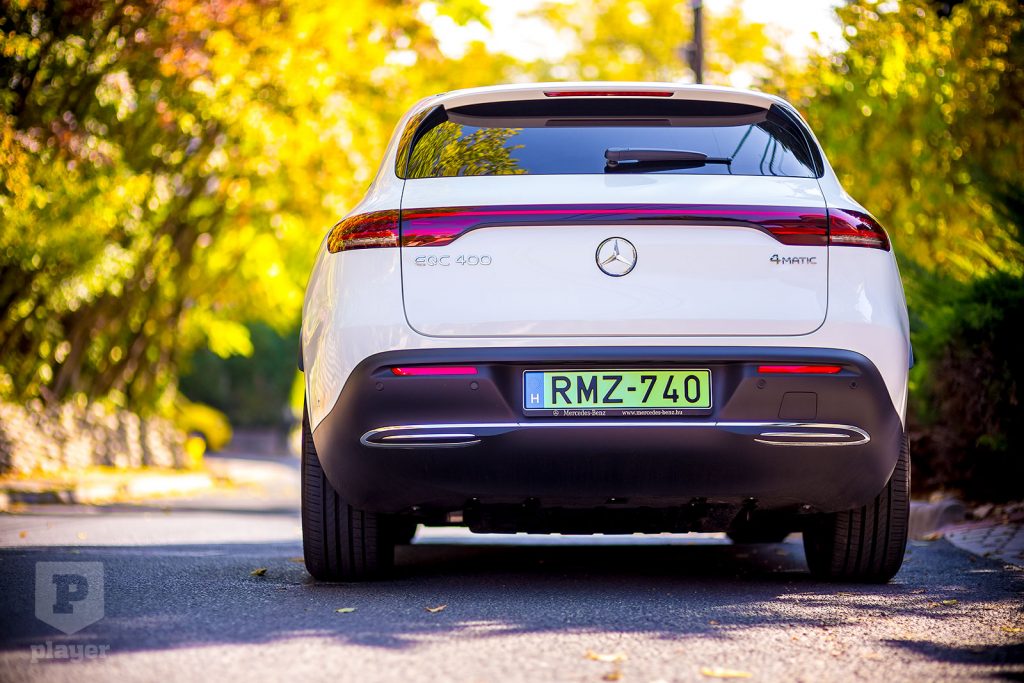 A kocsi legegyedibb része az eleje: a hűtőmaszkot a fényszórókból induló vonal keretezi alulról, felülről pedig LED-csík: hátul ez ma már nem különleges – de azért az EQC farán is végigfut –, elöl viszont úttörő megoldás, amit lehet ugyan parasztvakításnak nevezni, csak akkor tudomásul kell vennem, hogy paraszt vagyok. Annyira azért nem, hogy a hátsó, kipufogóvég-szerű dizájnelemek is tetsszenek: az emberek a dízelmozdonyokat is megszokták anélkül, hogy egy ideig még vizet forraltak volna bennük egy kis páráért, valahogy csak túllendülnek majd azon is, hogy ahol nincs mit kipufogni, ott kipufogó sem kell.