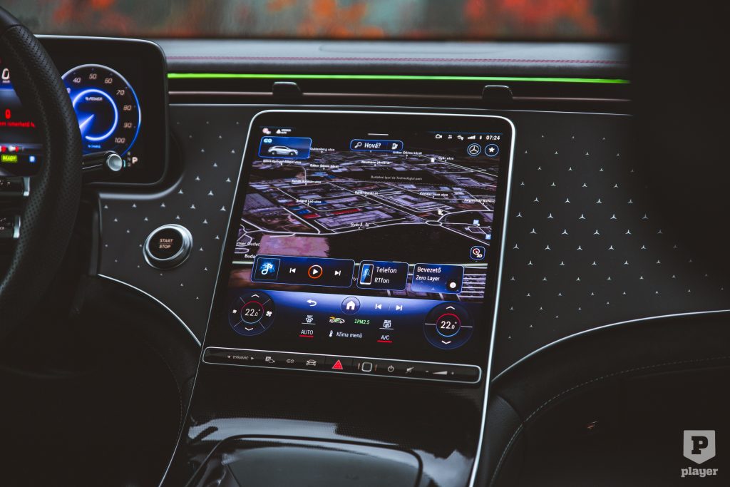 A kocsiban utazni igazi luxusélmény. Az ember elmormol ugyan egy nydpcsját, miután a szép, megvilágított, de vacak fogású kilinccsel nagy nehezen kinyitja az ajtót, majd csodálkozik egy kicsit a behúzáskor az ajtókárpitban meghajló fogantyú egyáltalán nem mercédeszes gyengeségén, de utána minden oké. Remekül szól a Burmester hifi, a klímakomfort tökéletes, zaj szinte semmi nem jön be a kétrétegű oldalablakokon, az ülések szélesek, puhák, kényelmesek. A LED-mátrix fényszóró működése éjjel önmagában is egy attrakció, a kocsi ügyesen, a szembejövőket a fénykévéből tapintatosan jó előre kitakarva mutat meg, emel ki mindent, amit látni kell. A dupla üvegtető alatt világos, barátságos a tér.