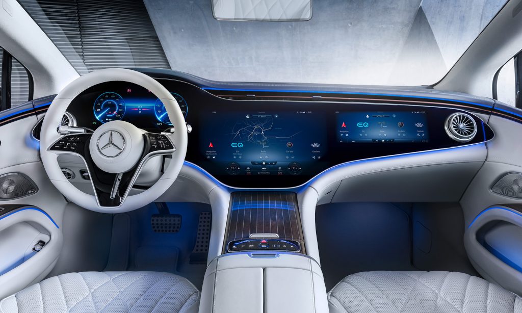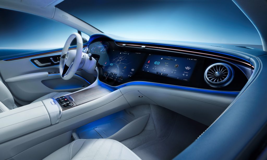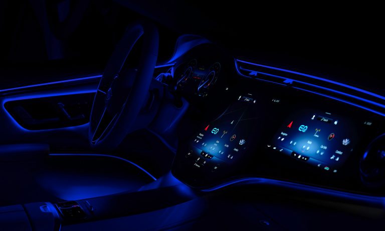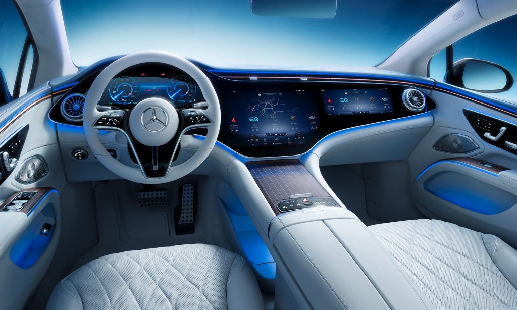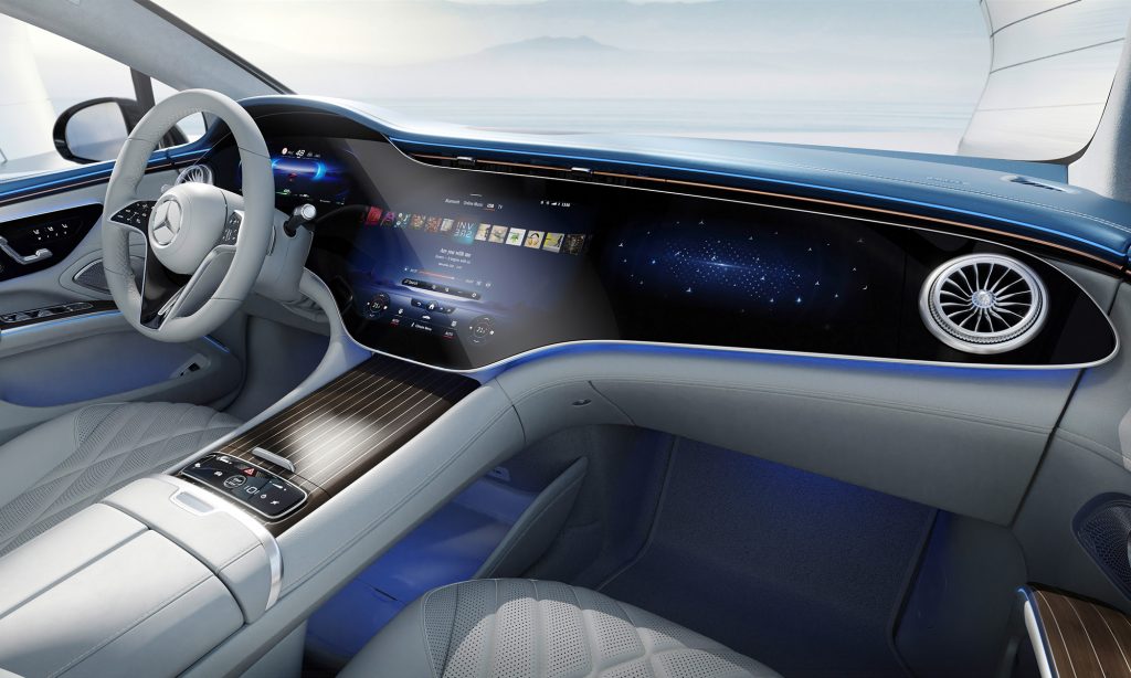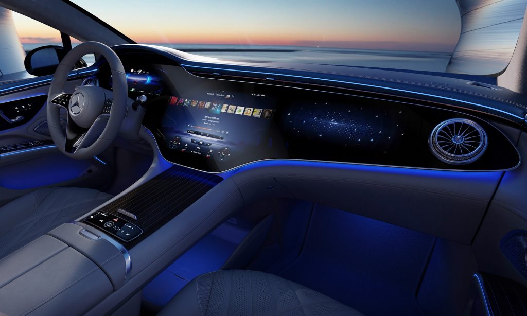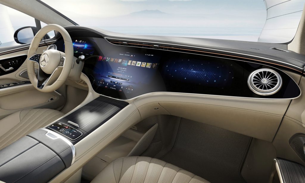 A belső tér legérdekesebb része a Hyperscreen névre keresztelt műszerfal, ami úgy néz ki, mintha az egész egy hatalmas, 56 colos képernyő lenne.
