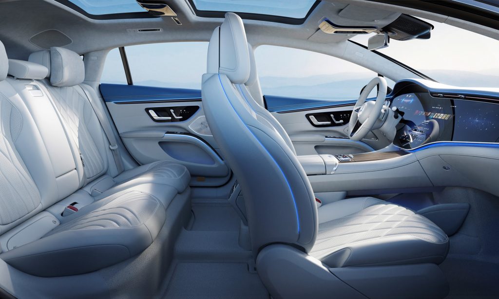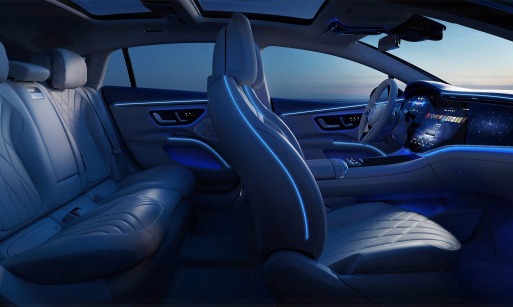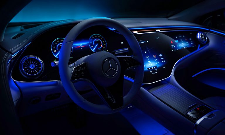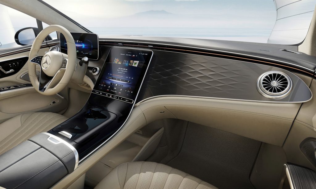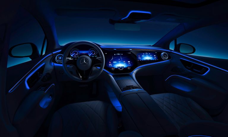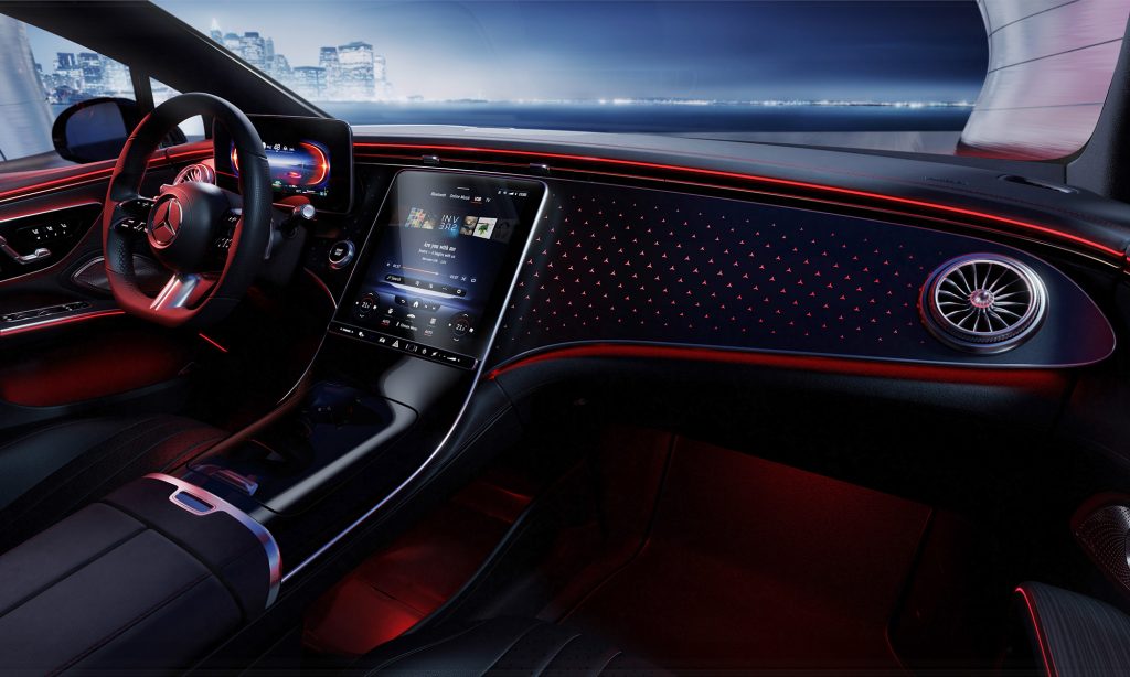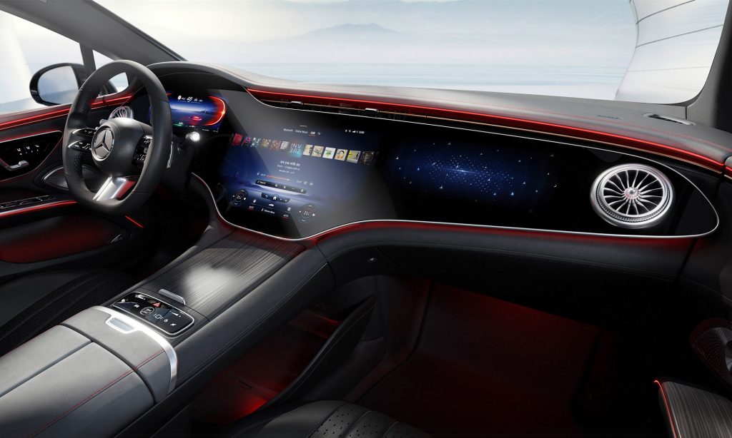 A belső tér legérdekesebb része a Hyperscreen névre keresztelt műszerfal, ami úgy néz ki, mintha az egész egy hatalmas, 56 colos képernyő lenne.