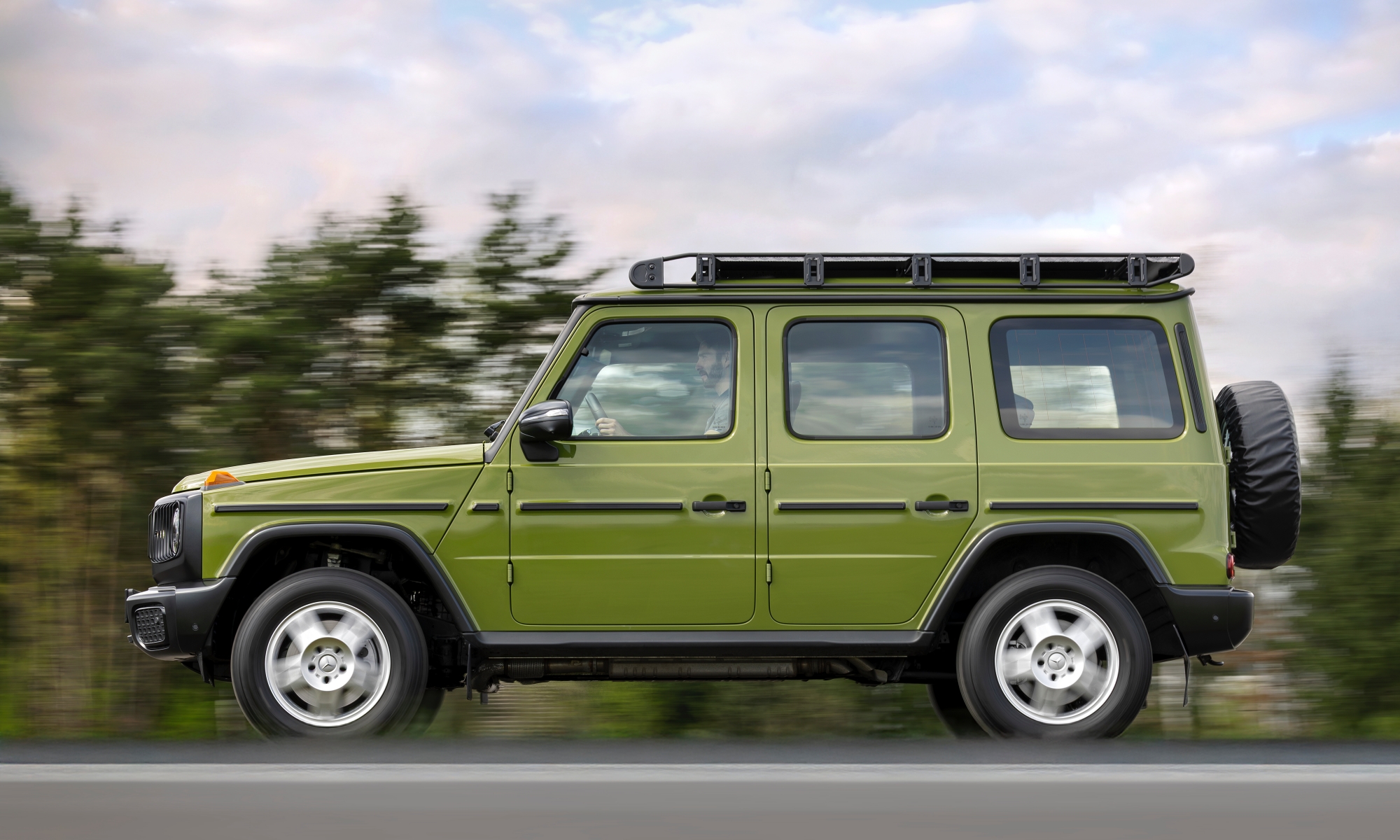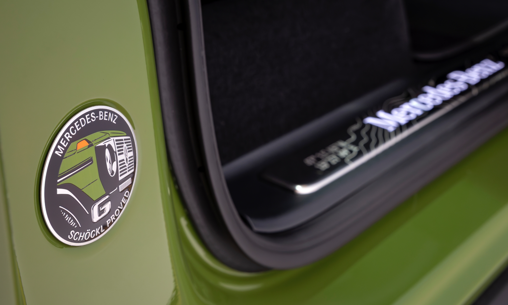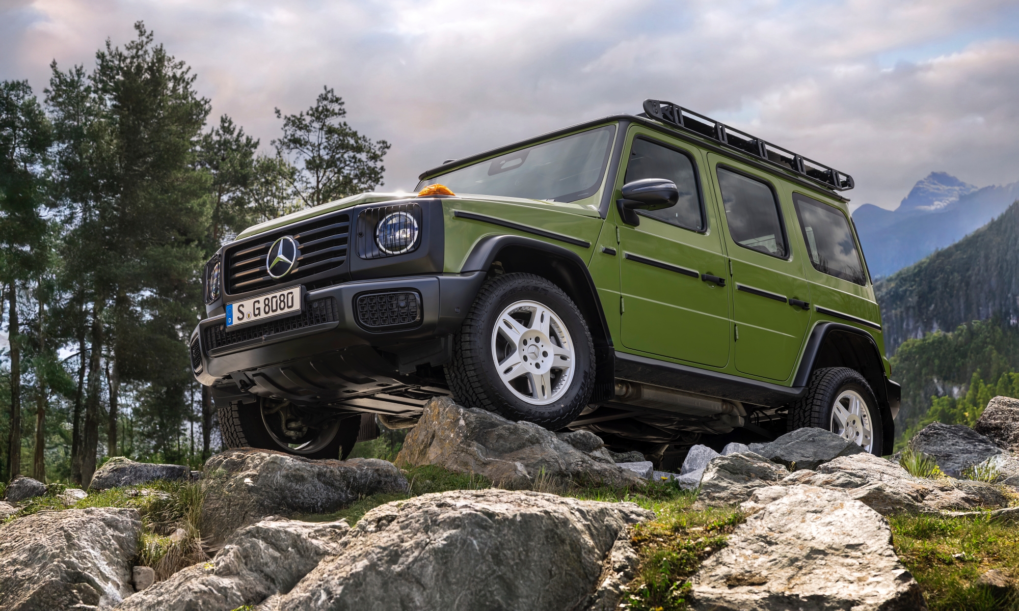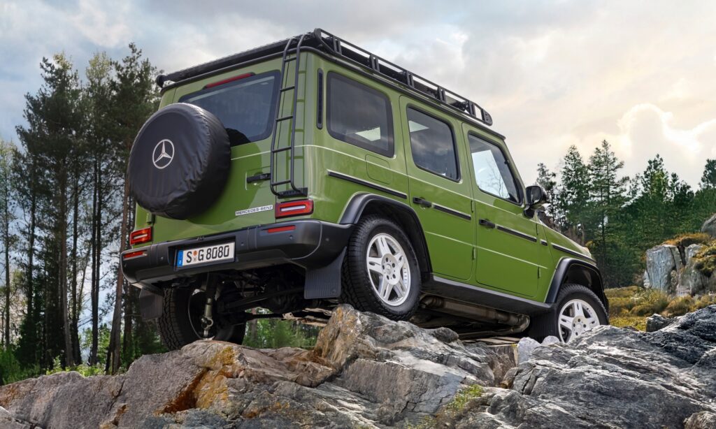 Sárga irányjelzők villognak az autó sarkain, a kerékjárati ívek pedig fekete színűek, akárcsak a hűtőmaszk és a LED-es fényszórókat keretező elem, mert így emlékeztet leginkább a nyolcvanas évek Mercedes-Benz 280 GE-jére. Tetőcsomagtartó kerül rá, melyre kis létrán keresztül lehet felmászni, de lámpákat is rácsok védik a belógó gallyaktól. Háromféle régimódi árnyalatot kevertek ki ehhez a különleges modellhez, de mind közül egyértelműen az agávézölddel mutat legjobban a Mercedes G-osztály.