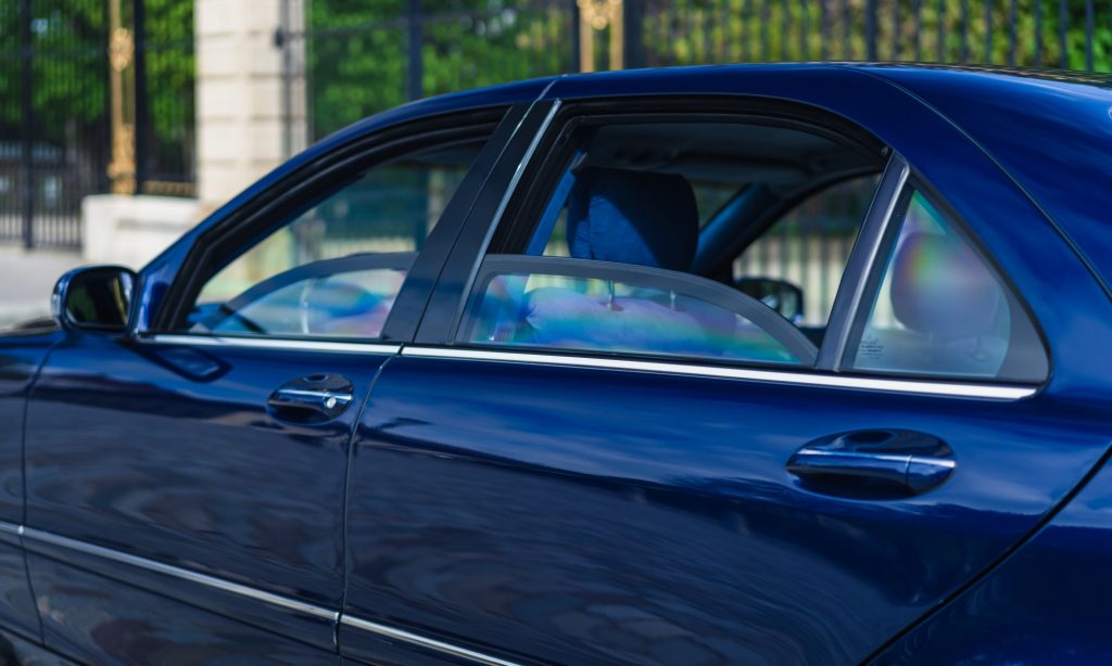 Golyóálló üvegein keresztül szinte rikít a Brabus S 500 ordítóan kék utastere.
