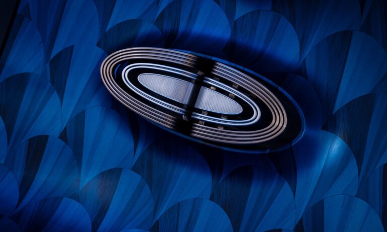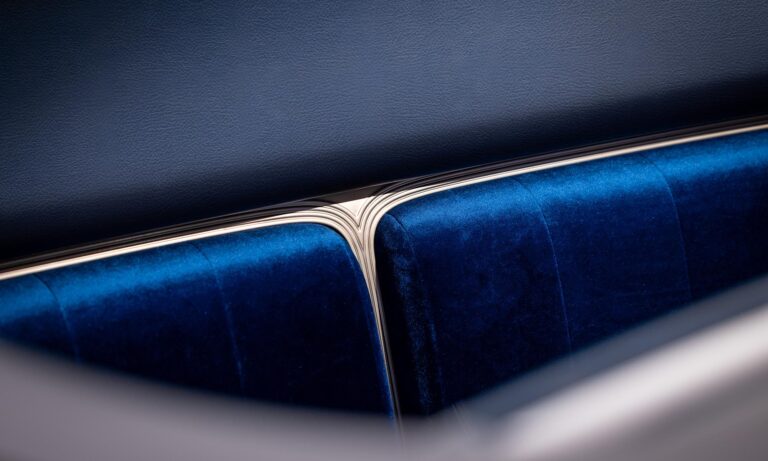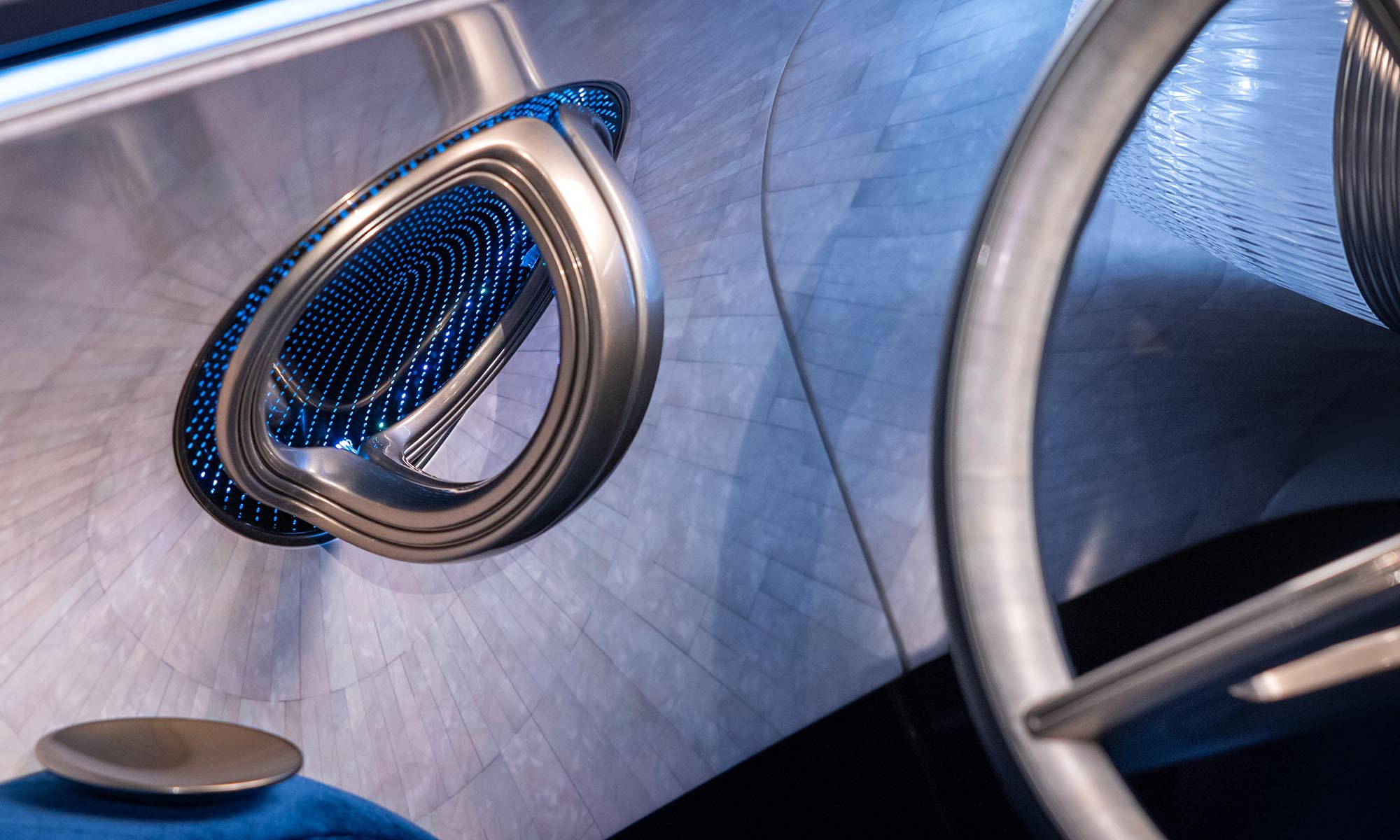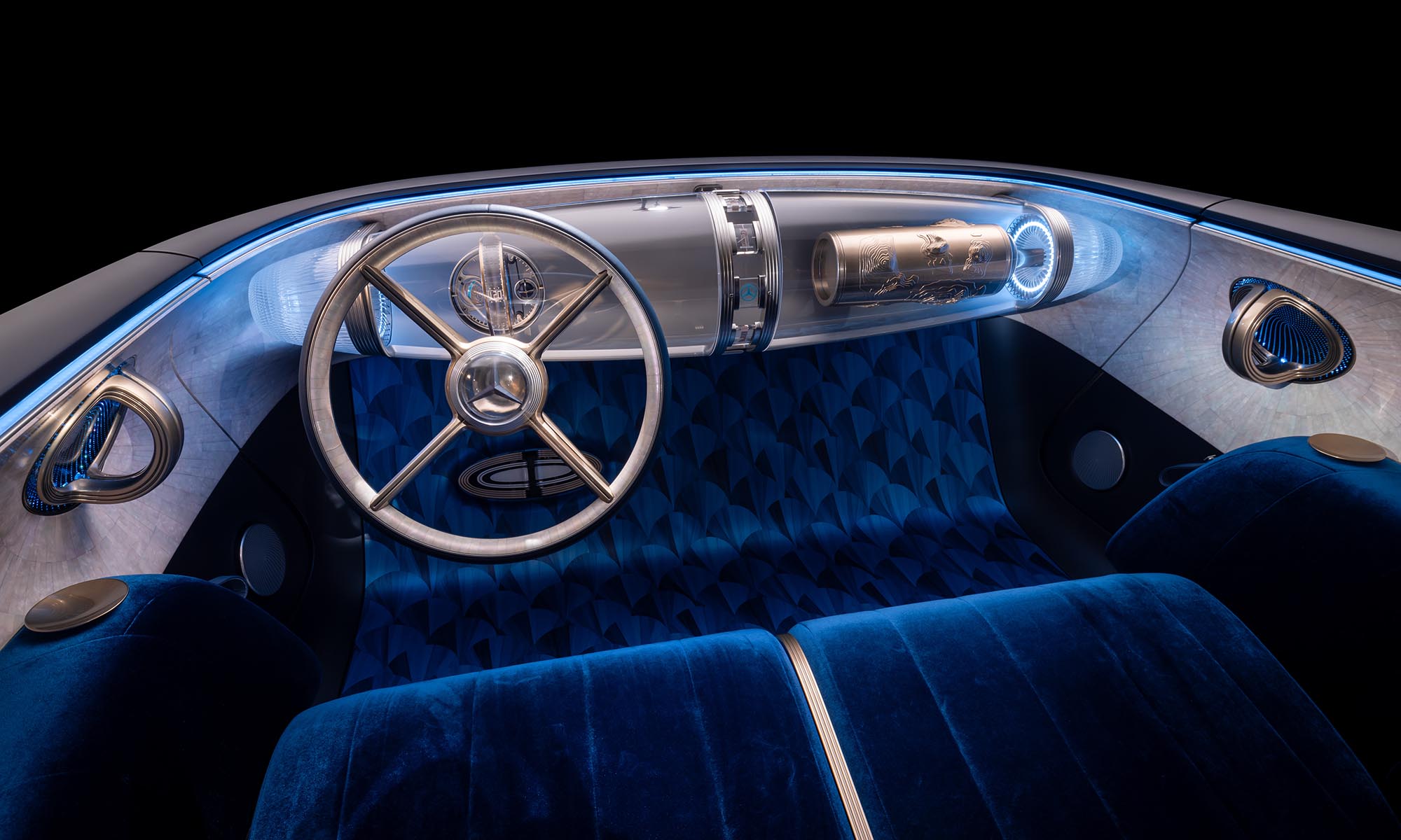 Belül is tartogat meglepetéseket a Vision Iconic. A Mercedes a jelenlegi, hatalmas képernyőkkel telezsúfolt belső terei után most egy „hiperanalóg” koncepcióval rukkolt elő. A kormánykerék egy klasszikus, art deco stílusú darab, a műszerfal lelke pedig egy átlátszó elem, a neve Zeppelin, és szinte lebeg a helyén, míg magán a műszerfalon klasszikus számlapok kaptak helyet.