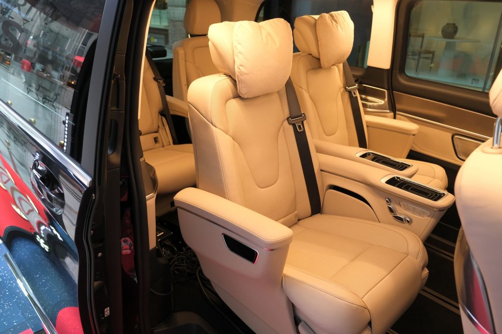 Az utastéri komfort a csúcskivitelben nyilván pazar. A V-osztályban a legjobb ülések nem elöl vannak, hanem középen, ahol párnácskás fejtámlás, személyenként külön induktív mobiltöltős, motoros mozgatású fotelek várják az utasokat:
