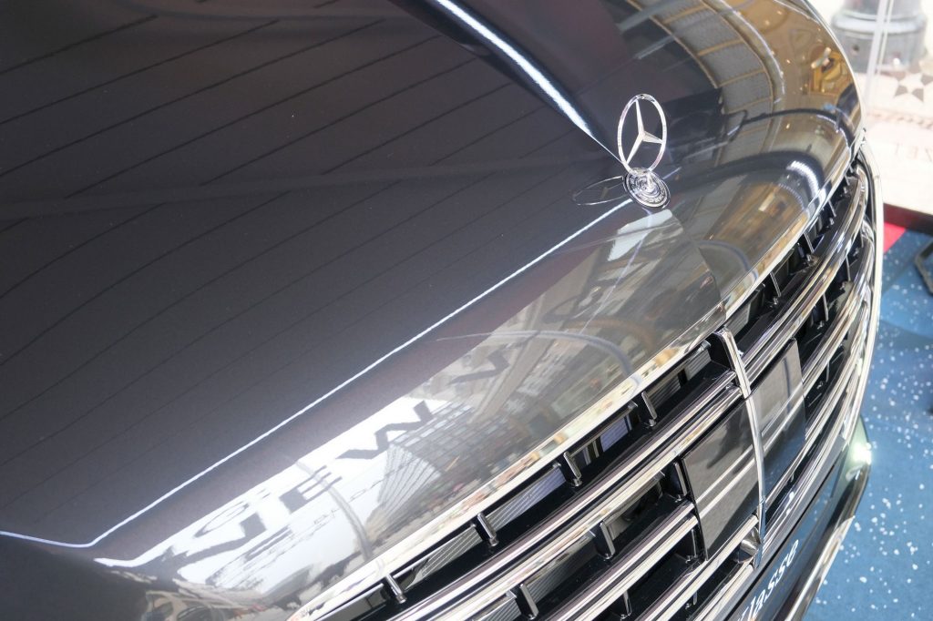 A kiállított példány egy csúcsfelszereltségű, Exclusive kivitelű példány. Ezt azonnal észre lehet venni már csak abból is, hogy a jövő évtől nagyobb, hangsúlyosabb hűtőmaszk indirekt megvilágítást kapott - no meg abból, hogy a díszfényes pajzs felett büszkén ágaskodik az állócsillag a motorháztetőn. Aki jobban ki van hegyezve a részletekre, a kocsi fenekén is észreveszi a változásokat: az új, 3D-s fényeffektekkel dekorált lámpatestet és a büszke Mercedes-Benz feliratot a külön nyíló hátsó szélvédő alatt:
