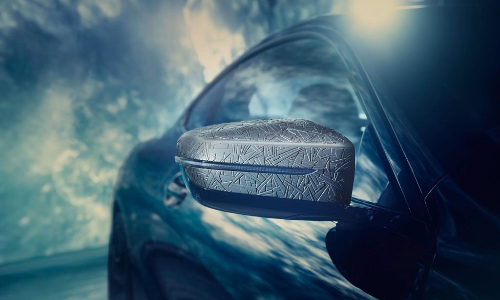 A mintázat belül a kézzel varrt tetőkárpiton és üléskárpiton, valamint a középkonzolon, kívül pedig a visszapillantó-házakon, a lökhárító és légkilépő betétein és a négy féktárcsában is visszaköszön.