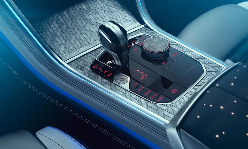 A legújabb BMW-kben csiszolt üvegből is készülhet a váltókar, a startgomb és az iDrive kapcsolója, ami ezen a 8-ason viszont valódi meteoritból van.
