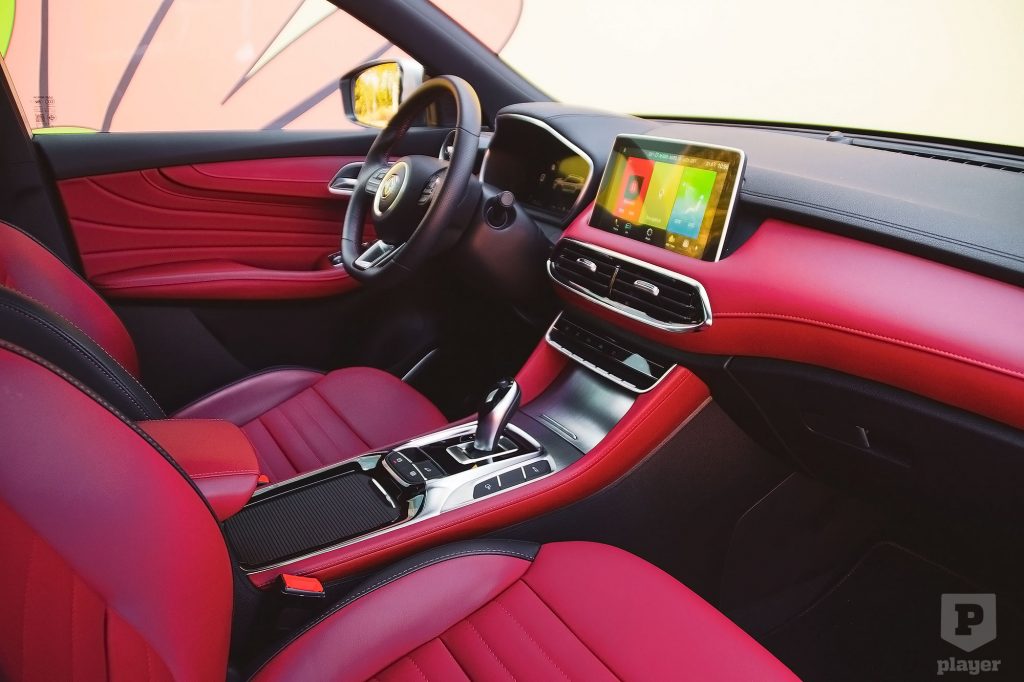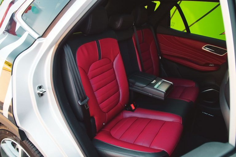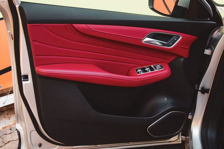Odabent azonnal kisüti az ember szemét a burgundivörös bőr(szerű) kárpitozás. Ez nem kötelező eleme a kocsinak, az alapértelmezett huzat egyszerű fekete, a piros belső a Luxury csúcsváltozathoz mindössze 150 ezer forintért rendelhető extra. Ízlés kérdése, hogy bejön-e. Én egészen gyorsan el tudtam fogadni, mert a krómmal, zongoralakkal és szálcsiszolt aluval amúgy is zsúfolt teret ez az újabb esztétikai lórúgás gyakorlatilag túllendíti a giccs határán, ki a túloldalra, egy olyan területre, amit akár már nevezhetünk érdekes, sajátos stílusnak is.