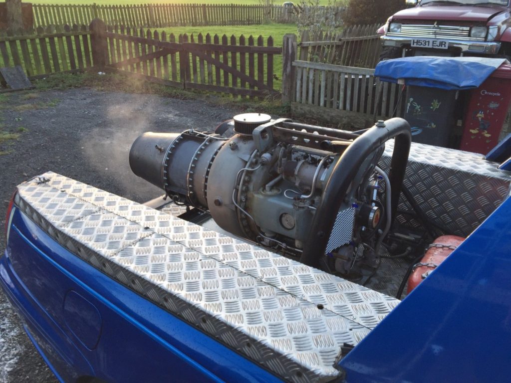 Először is platóssá kellett alakítani a járművet, de ezzel a pick-uppal úgysem tudsz szállítani semmit, mert az egész rakodóteret elfoglalja a sugárhajtómű. Ami nem egy kiszuperált darab, néhány kapcsoló lebillentésével és egy startgombbal életre is kelthető, külön üzemanyagtartályról működik. Biztos lehetsz benne, hogy ha ezt vezeted, nem fognak rád tapadni hátulról.