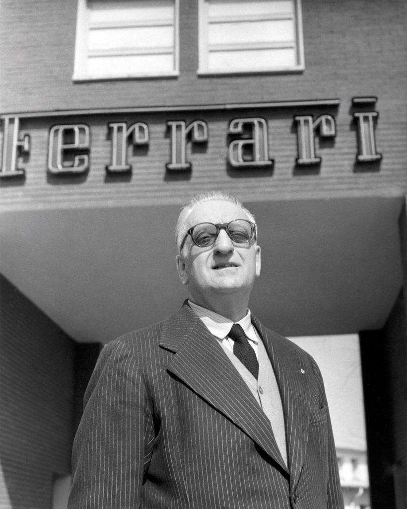 Enzo Ferrari 1957-ben a gyár bejáratánál...