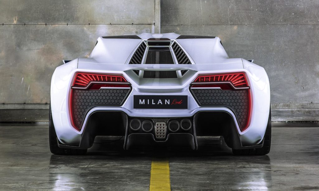 A neve Milan Red, a 4,73 méter hosszú karosszéria formája pedig elég futurisztikus ahhoz, hogy felkapd rá a fejed. Szinte az egész orra egy nagy légbeömlőből áll, és ugyanez a motívum ismétlődik a hátulján is. A 6,2 literes V8-as motorját középre építették be, és négy turbóval látták el, így 1325 lóerős teljesítményre és 1400 Nm nyomatékra lesz képes.