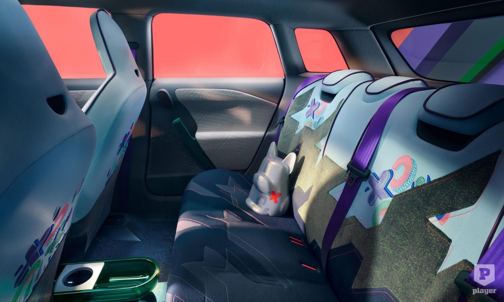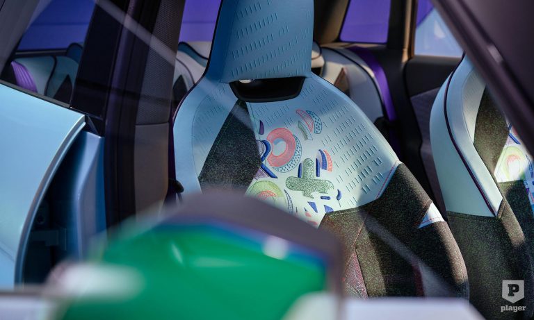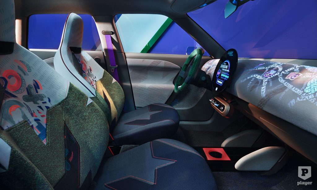 ezért a kormánykereket velúrszerű anyaggal borították, és még a küllőkre is jutott a szövetből. A tarka kárpitok a kilencvenes évek divatját juttatják eszünkbe, a minimalista műszerfalat pedig a középen lévő kerek OLED kijelző uralja, az alatta lévő kapcsolók egyike az irányváltó.