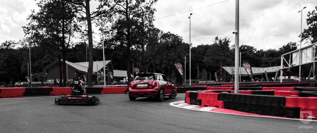 Mivel a Mini feldobta nekünk ezt a magas labdát a gokartos párhuzammal, mi mély tisztelettel le is csaptuk. Tegyük hozzá, első körben már az is nagy nehézségnek tűnt, hogy találjunk olyan gokartpályát, ahol a Mini elfér. A Hellnél is azt mondták a srácok, hogy fotót készíthetünk az autóról a pályán parkolva, de ők biztosak benne, hogy a kanyarokban nem fog elférni. Felvettük a kesztyűt, és megmutattuk, hogy elfér. És toltuk neki, ami kifér. Átlagos pályaversenyzőként először az elektromos gokarttal fedeztük fel az ívet, és egy nem kiemelkedő 46 mp-es köridővel zártunk. A rekord valahol 41 körül lehet. Aztán jött a Mini, és igyekeztünk minél közelebb férni a gokarthoz, ami az egyenesekben nagyon könnyen ment, de volt a pályának két olyan visszafordítója, ahol csak lépésben fordult el az autó. Az eredmény azonban minket is meglepett: még így is sikerült 52 mp-cel végezni.