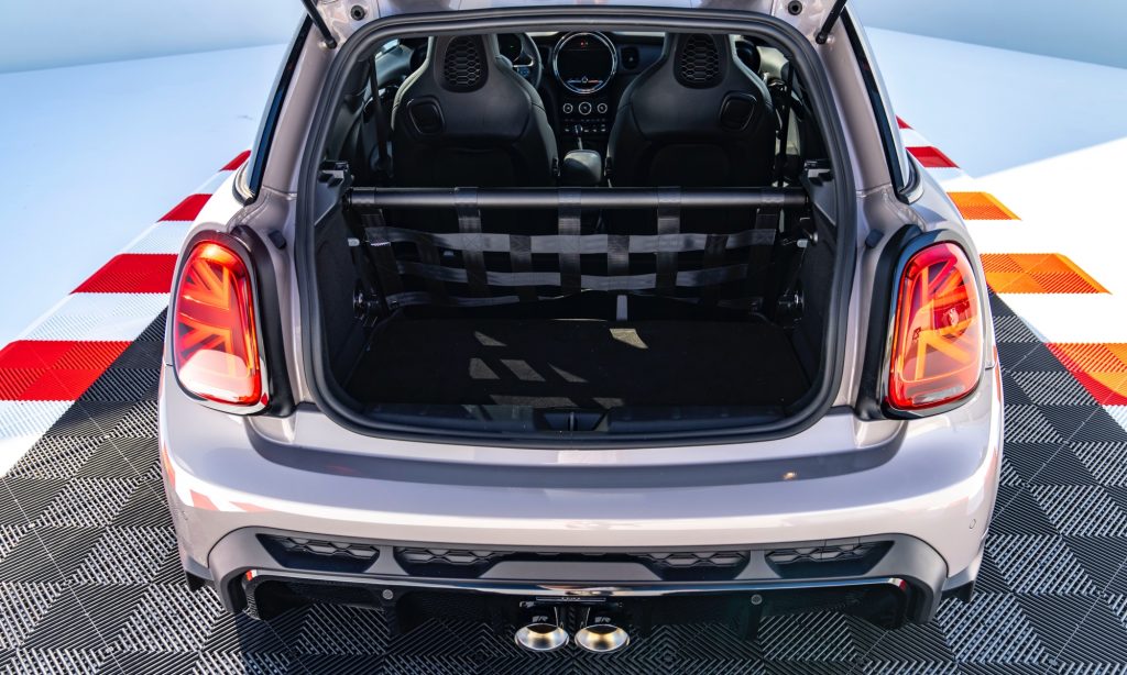 Értékes kilókkal lett könnyebb az autó a Stern Performance Parts Clubsport készlettel, ami tulajdonképpen a hátsó ülések helyére szerelt keresztmerevítőt és a hálót tartalmazza, valamint a kiegészítő kárpitokat, hogy esztétikus maradjon a MINI utastere kétszemélyessé alakítva is. Bentről látható igazán a tükörburkolatok belső oldalára ragasztott Nürburgring matrica, mely igazán kedves apróság.