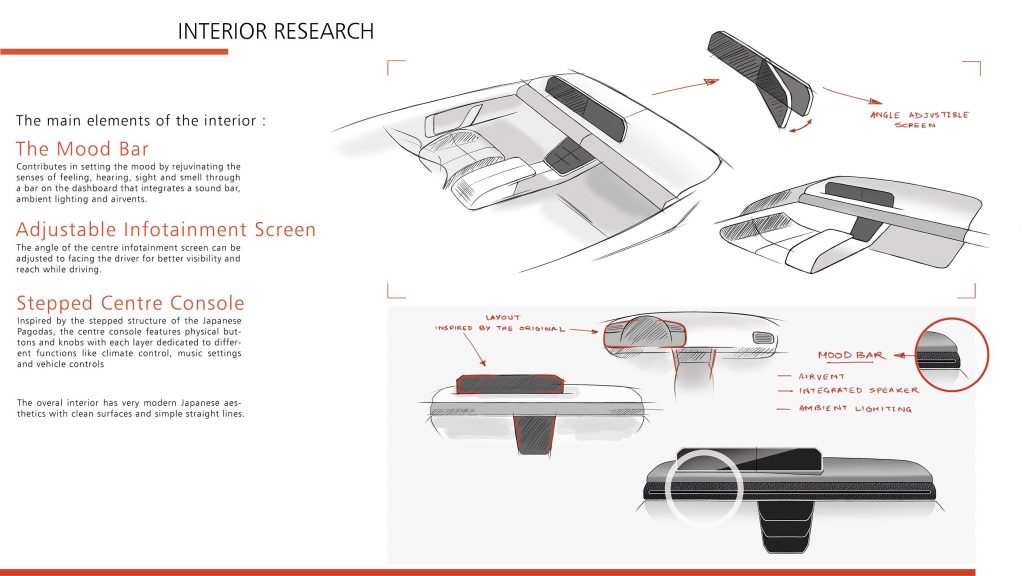 míg a lépcsőzetes középkonzolt a japán pagodák ihlették, a felületeket minőségi kárpittal vonnák be. A műszeregység és az infotainment dupla képernyője állítható lenne, hogy minden vezető jól láthassa.