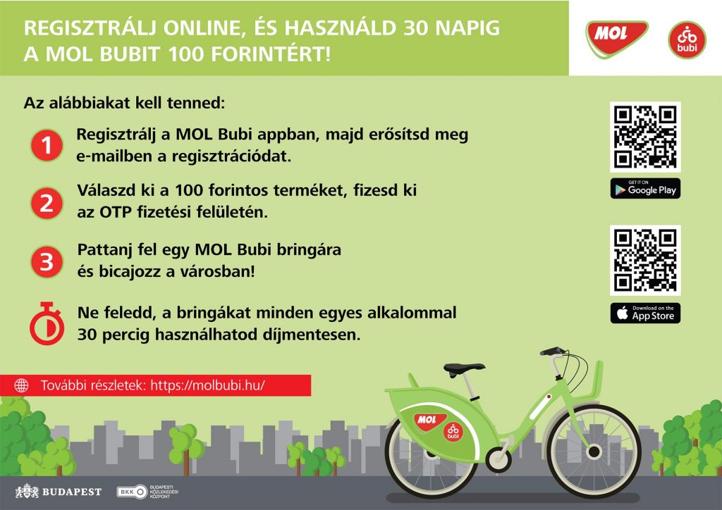 a szerződéskötésre mostantól az interneten is lehetőséged van, a százforintos havidíjat is online fizetheted ki. A közbringák használata az első 30 percben ingyenes, utána minden további 30 perc 500 forintba kerül.
