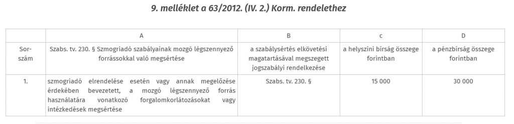 A szmogriadó megsértése olyan szabálysértés, melynek büntetési tételét kormányrendelet rögzíti (méghozzá a 63/2012-es számú). Eszerint a szmogriadót megszegő autós 15 ezer forintos helyszíni bírsággal számolhat, amely, ha vitatni próbálja a bírságot, de nincs igaza, 30 ezer forintos pénzbírsággá puffad: