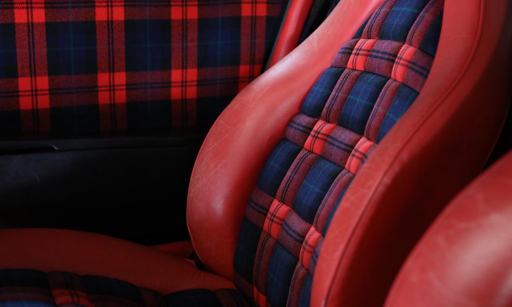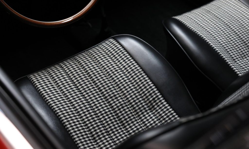 A pepitánál is érdekesebb a mintája ennek az integrált fejtámaszos ülésnek, ami ebbe az 1977-ben gyártott 911-be került, a dizájn a motorsportból ismerős kockás zászlót idézi. Az SC pedig a Super Carrera rövidítése.