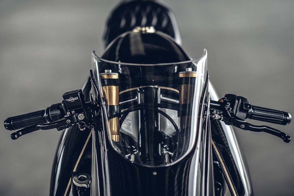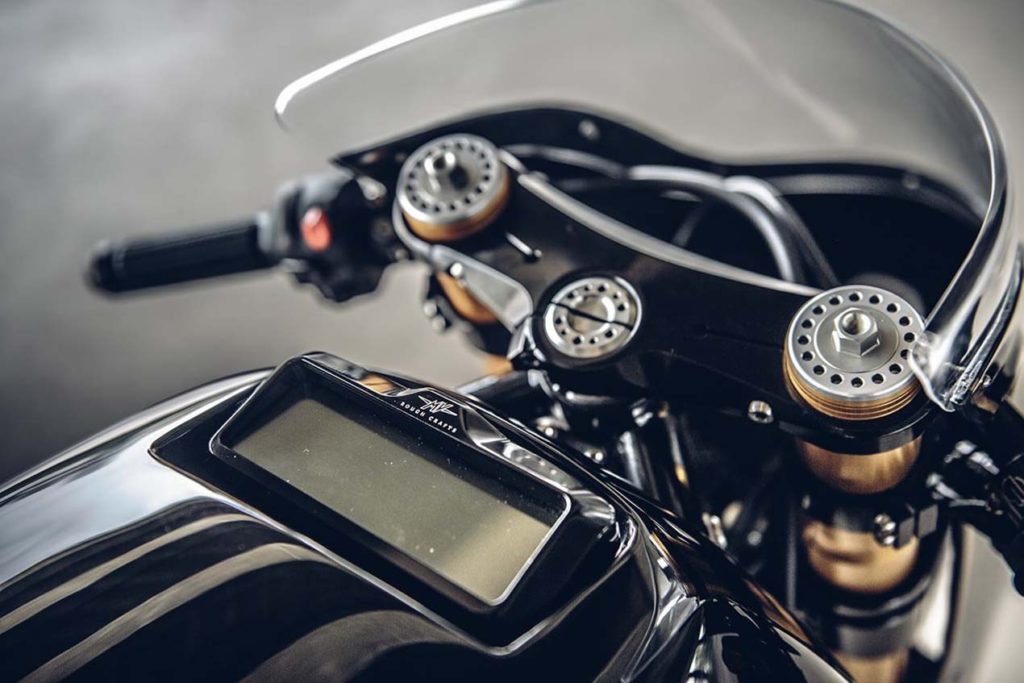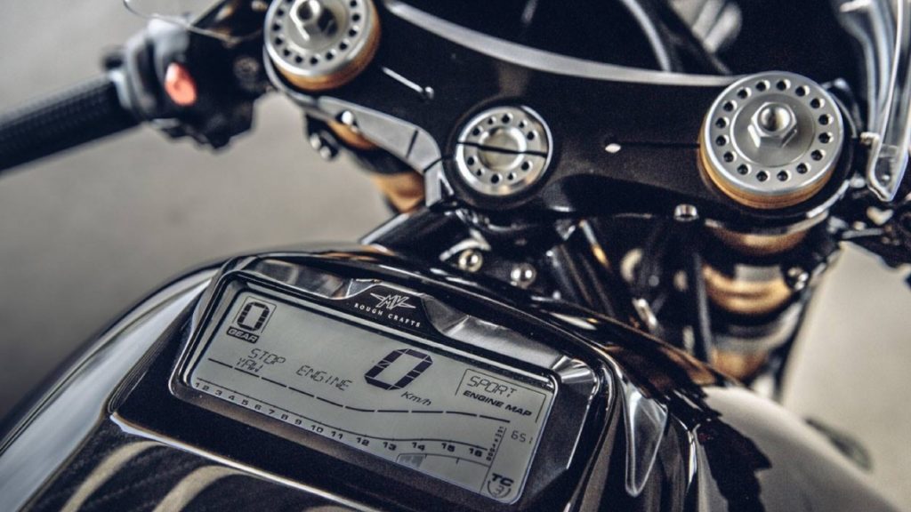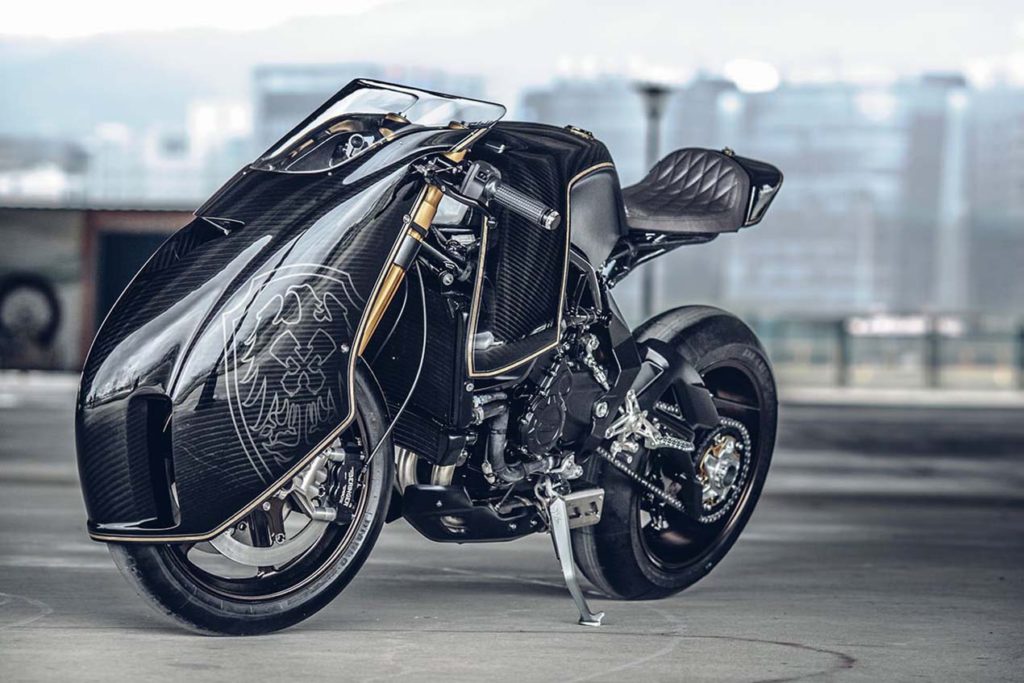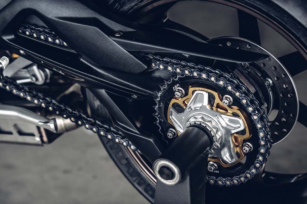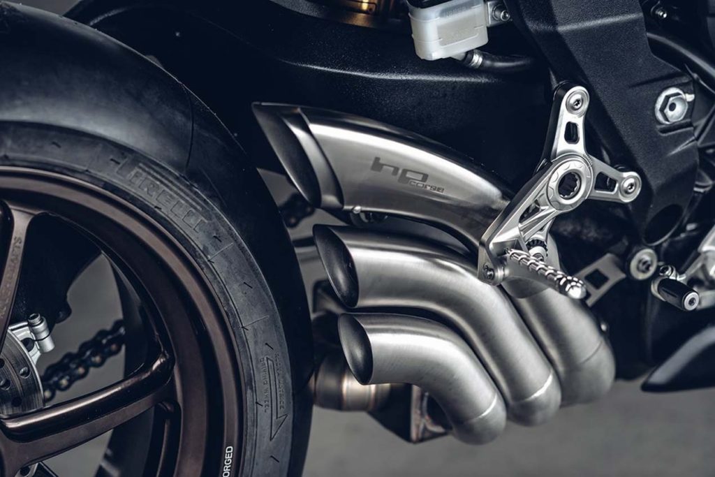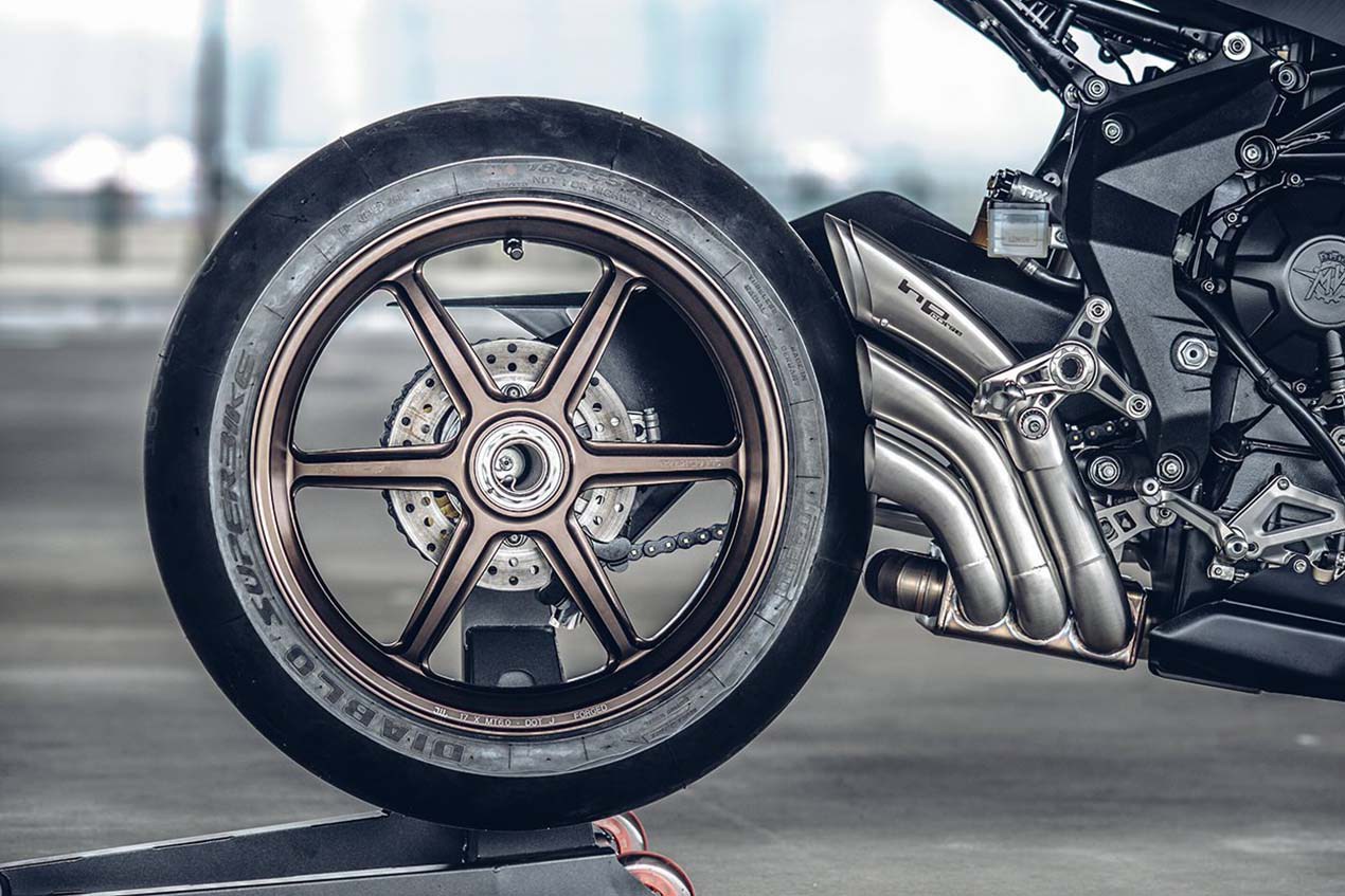A régi sebességrekordereket idéző formájú, az első kerekeket csak részben takaró idom természetesen szénszálas anyagból készült, és szemből nézve látszik, hogy nyílást vágtak rajta a fékek és a motor hűtésére. Az egyoldali hátsó lengőkar vagy a hátsó kerékhez illesztve mesterien formált hármas kipufogó láttán nehéz eldönteni, hogy tovább nézegetnénk, vagy már indulnánk is vele.