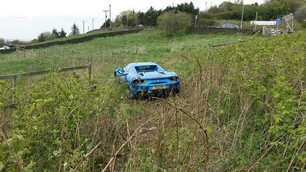 Az első West Yorkshire-ben történt Outlane közelében, ahol a Ferrari angol PR-autóját sikerült megcsuknia egy újságírónak. Ezt a kék Spidert vezette anno Jeremy Clarkson, amikor még a Top Gearben kereste a milliókat. Ő talán még ki is tudta volna fizetni a kárt, ha nagyon akarta volna, de az a londoni zsurnaliszta, aki sajnálatos módon nem tudta az aszfalton tartani a verdát, biztosan nagy adagokban eszi az ideget a baleset óta.