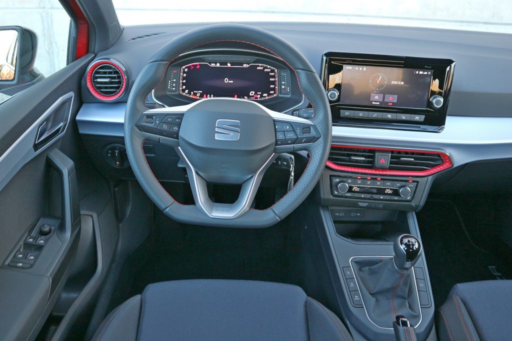 A piros autó fenekén található másik felirat, az FR azt jelenti, hogy tesztautónk az Ibiza sportos hangulatú változata (szemben a racionális Style-lal és a luxybb Xcellence-szel). Kizárólag az FR felszereltség mellé választható a modellhez kapható legerősebb motor, a másfél literes, 150 lovas négyhengeres, de a mi kocsinkban nem ez dolgozott, hanem az egyliteres, háromhengeres kis VW-motor, 110 lóerővel, 6 fokozatú kézi váltóval. (Ugyanez a blokk 95 lóerővel, ötös váltóval kérhető Style kivitelben, vagy a 110 ló mellé hétfokozatú DSG-vel társítva az Xcellence-ben).