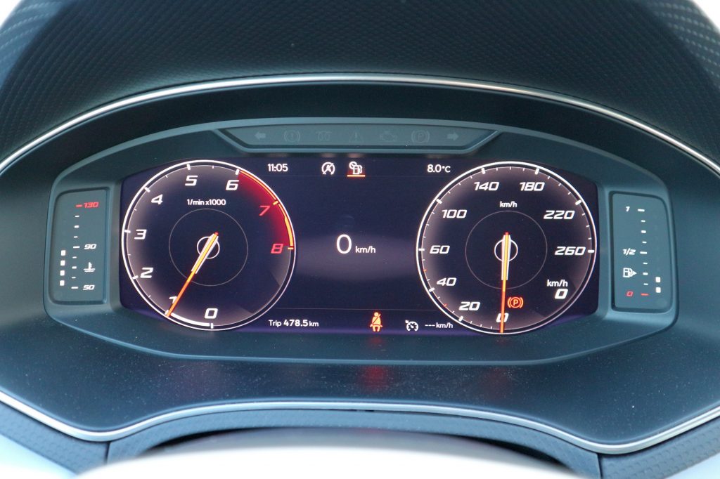 A műszeregység fő funkciója is megsínylette ezt a szörnyű virtuális forradalmat: nehéz értelmezni, mit is látunk. Igazán látványos a három fő layout, de amikor az ember vezet, elsősorban mégiscsak arra lenne kíváncsi például, hogy mennyivel megy éppen, nem arra, hogy milyen szép kis rajzolt autó körül bukkannak fel a jól-rosszul leolvasott korlátozó táblák a képernyőn. Márpedig a sebességérték eleve kicsi, ráadásul hol ide, hol oda kerül a nézetváltások közben. A mutatós klasszikus nézetben pedig egy kicsit durvának találom a sebességmérőn azt az amúgy is torzítva ugráló léptéket, ahol a 60 után a 100 következik: