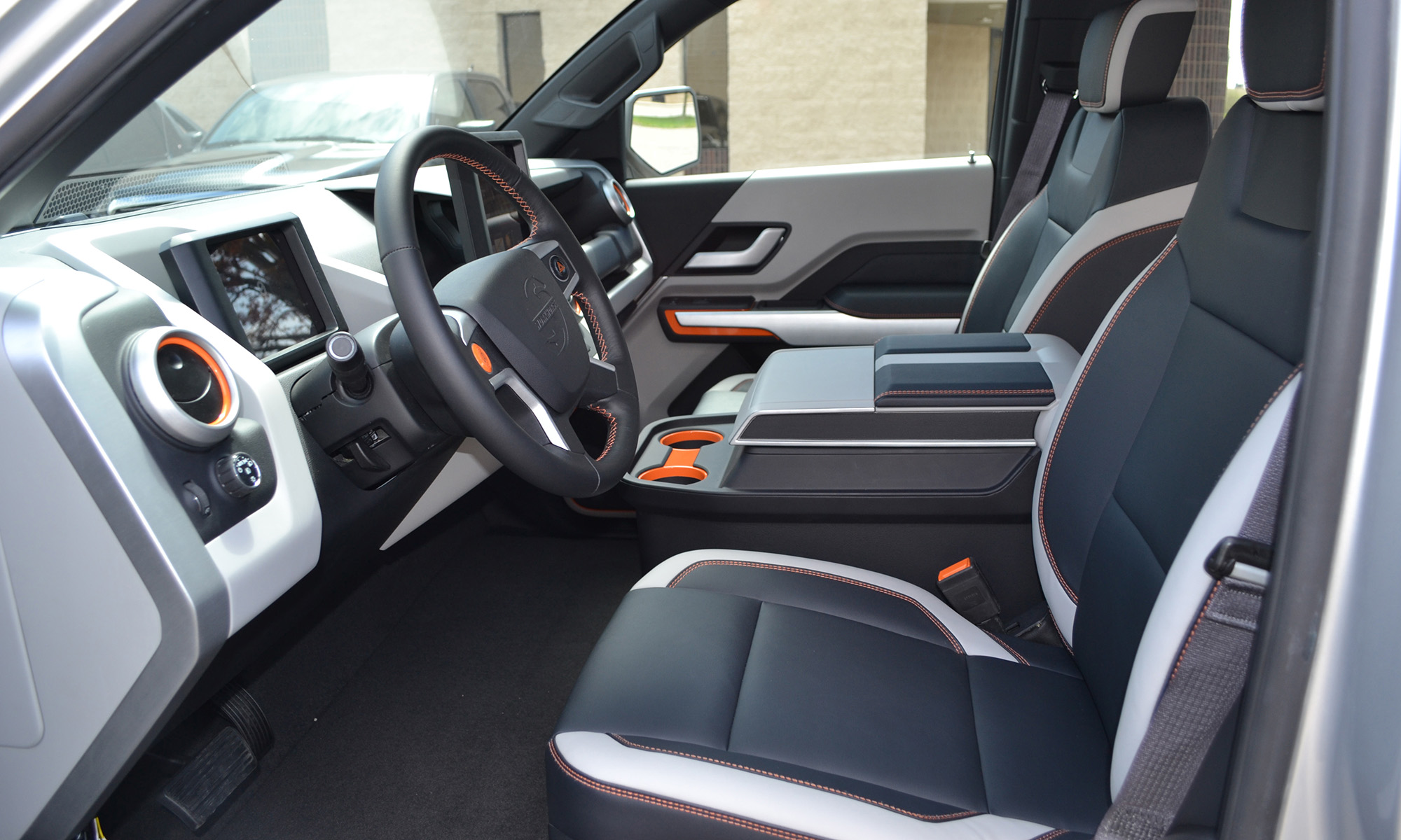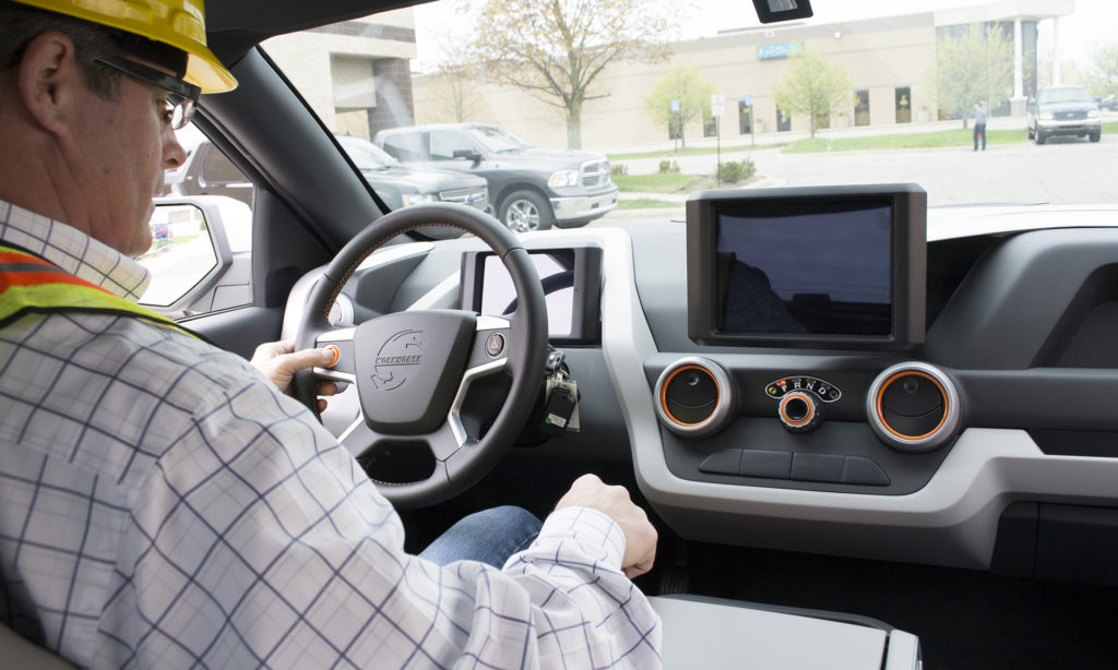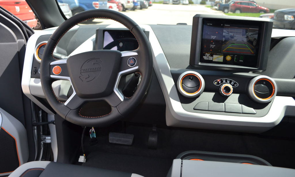 Belül sem kifinomultabb a Workhorse, de nem is egy kategória a Teslával, ennek az autónak nem kell igényesnek lennie. Ami szükséges, az leolvasható a kormánykerék mögötti kijelzőről, minden mást pedig a központi érintőképernyőről lehet kezelni. Azt, hogy előre vagy hátrafelé menjen az autó, az alatta lévő forgótárcsával lehet kiválasztani.