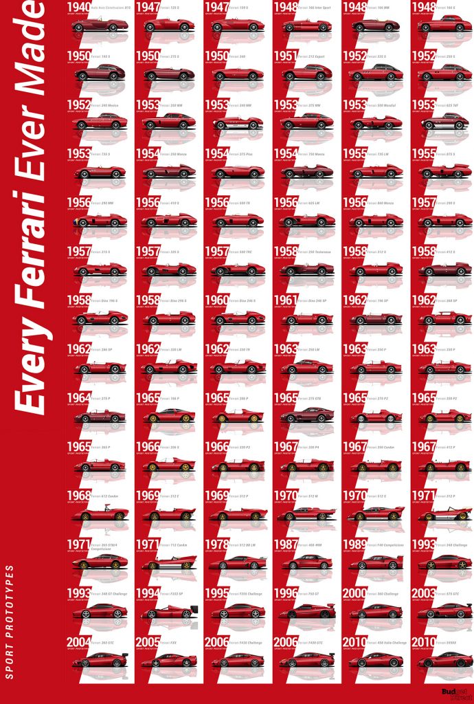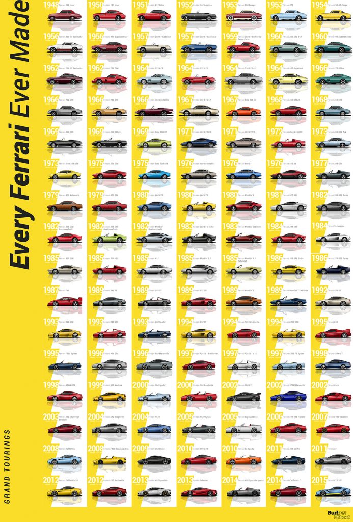 Az összes Ferrari egy tablóra rendezve olyan jól néz ki, hogy szívesen látnánk poszterre nyomtatva is a lakásban.