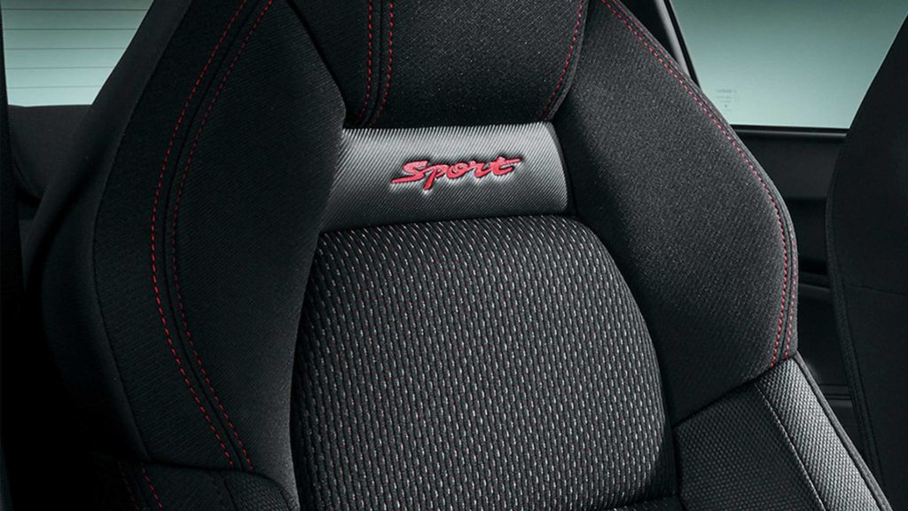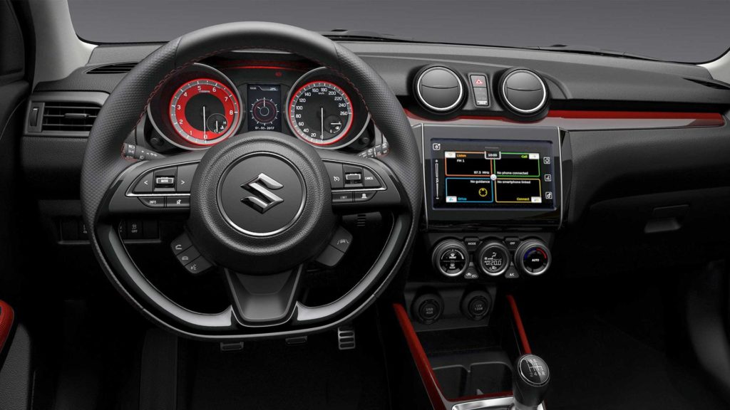 Belülről is láthatod már, hogyan képzelik a Suzukinál a sportos kisautót. Az alul kiegyenesített, D-alakú kormánykerék már az alapmodellben is benne van, de itt perforált bőrrel vonták be azt a részét, ahol úgyis markolni fogod, és az ülések is vaskosabbak. A belső teret piros betétekkel dobták fel, és piros a fordulatszámmérő számlapja is, hogy tudd, mit kell nézni gyorsulás közben.