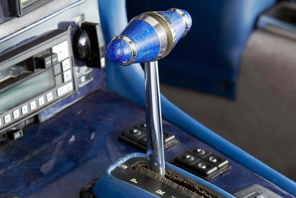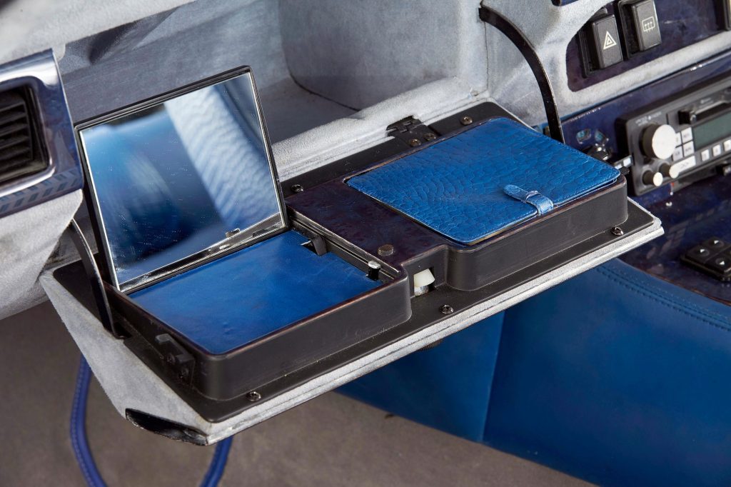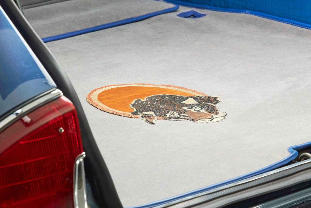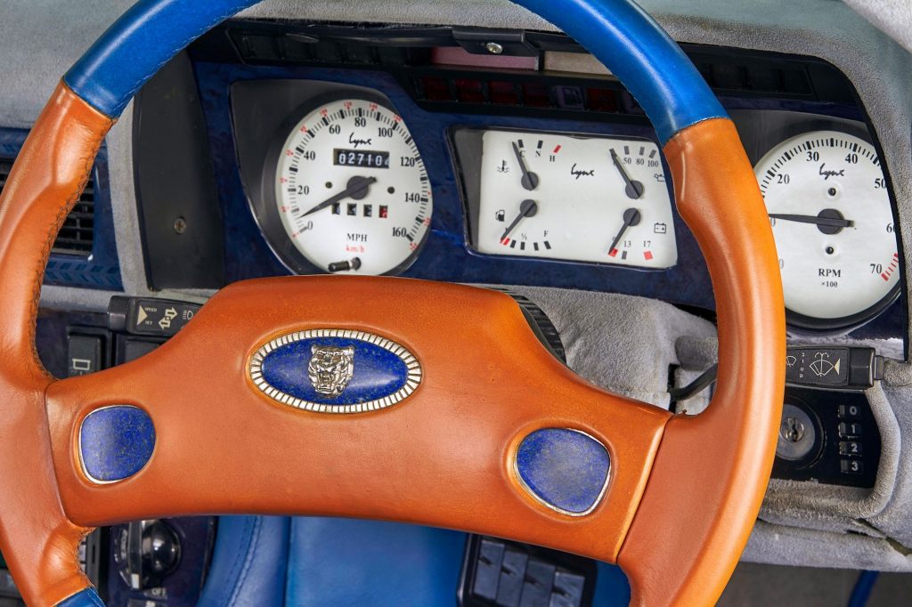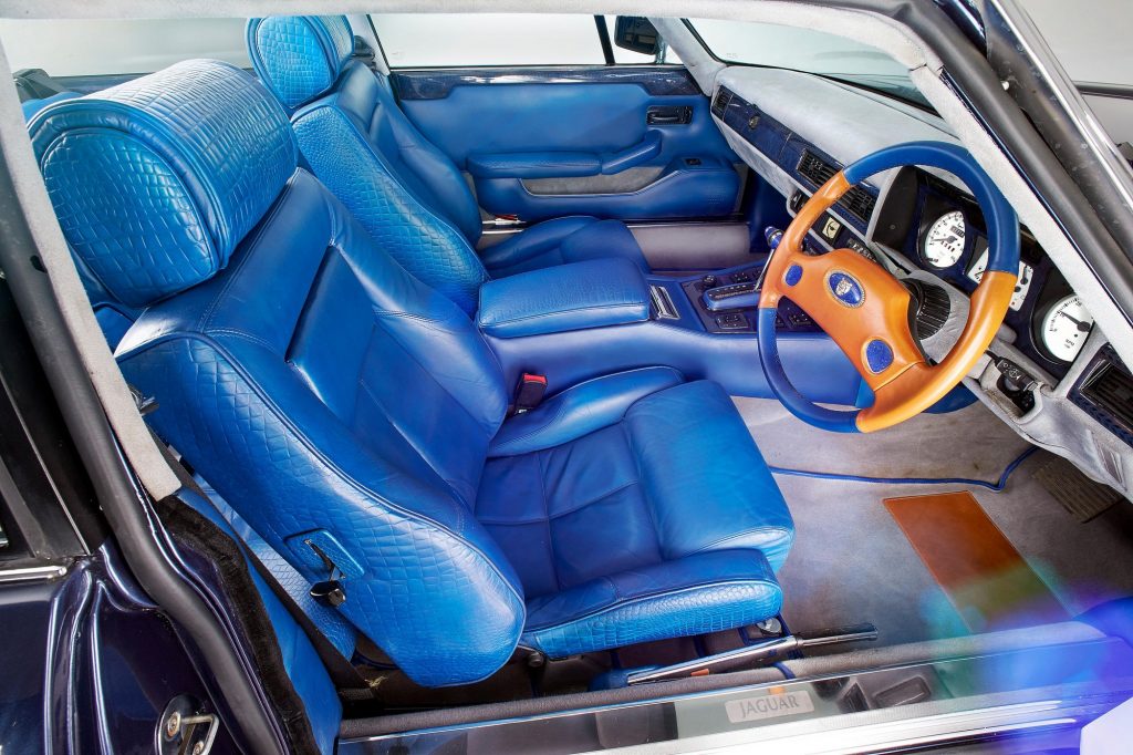 Az autó műszerfalát Antonio kékre lakkozott szilfa betétekkel és irdatlan mennyiségű, kézi munkával kékre festett olasz borjúbőrrel díszítette. Az órák számlapjait fehérre színezte, a kormányt barna és kék bőrrel vonta be. A kartámaszokat krokodilbőrrel burkolta, az ajtóbehúzó fogantyúkat szintén kékre színezett kőrisfából készítette el újra. A tetőkárpitozás Alcantarából készült, a kormányközépbe és a sebességváltó választókarjába lazúrkő betétek kerültek. A csomagtér hímzett jaguárfejes (miért nem hiúzfejes?) szőnyege is Gucci-termék, a kocsihoz természetesen egyedi utazótáska-kollekció is készült.