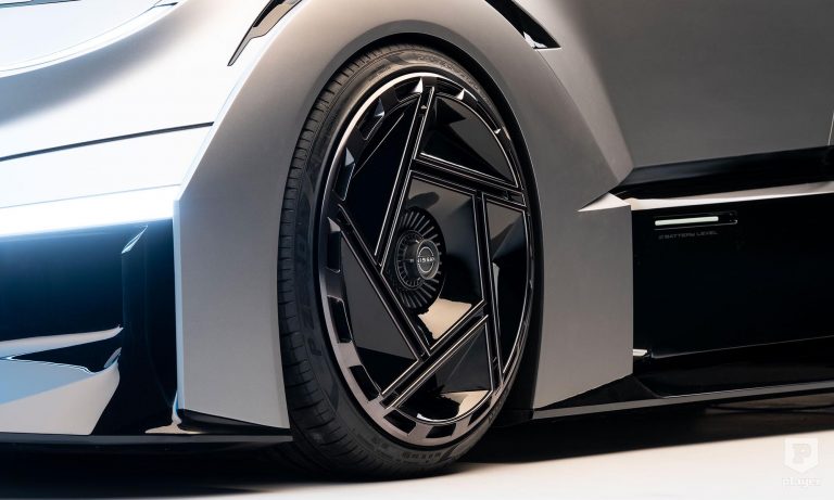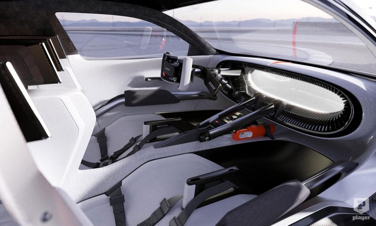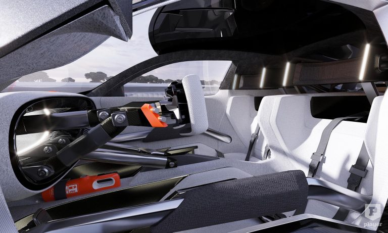 Belül lényegre törő, mint egy versenyautó, a két kagylóülést hatpontos övekkel szerelték, a kormánykerék egészen szögletes. Sorozatgyártásba persze ebben a formában egészen biztosan nem kerül, de