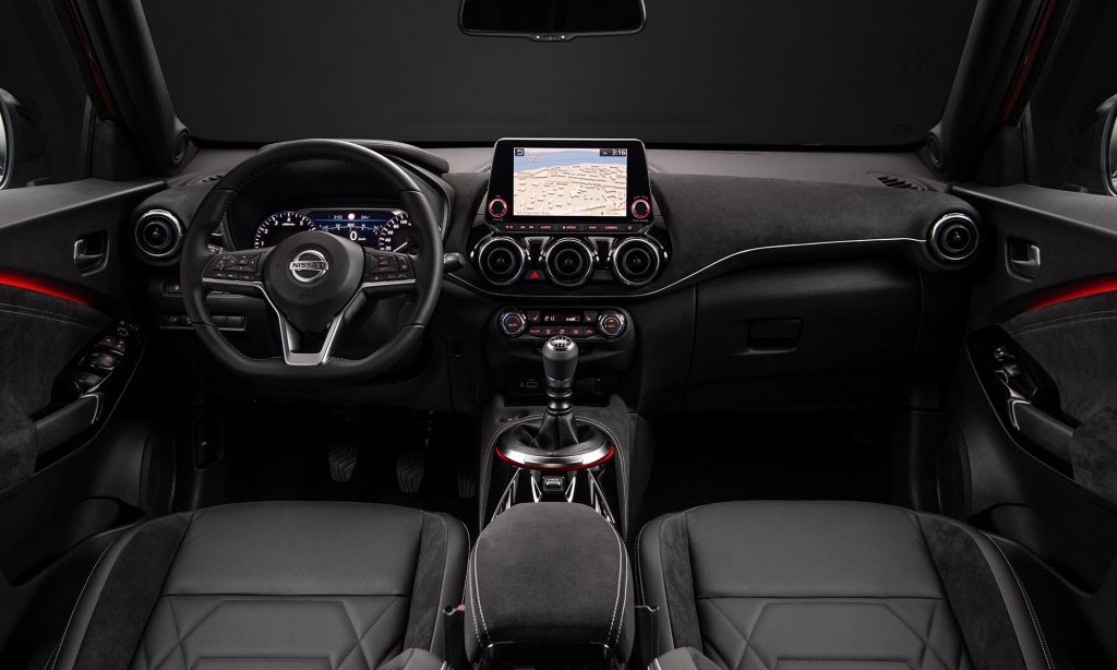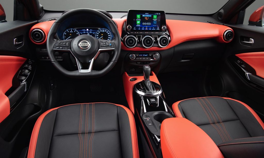 A berendezés is megőrizte a Juke stílusát a formás középső konzollal, a 8 colos érintőképernyő okostelefon-tükrözésre képes,