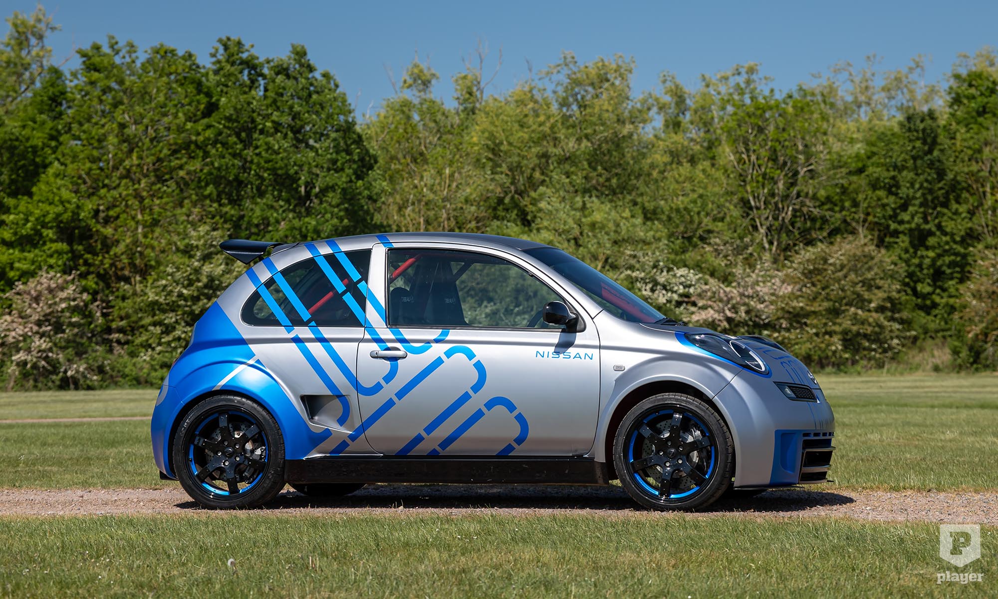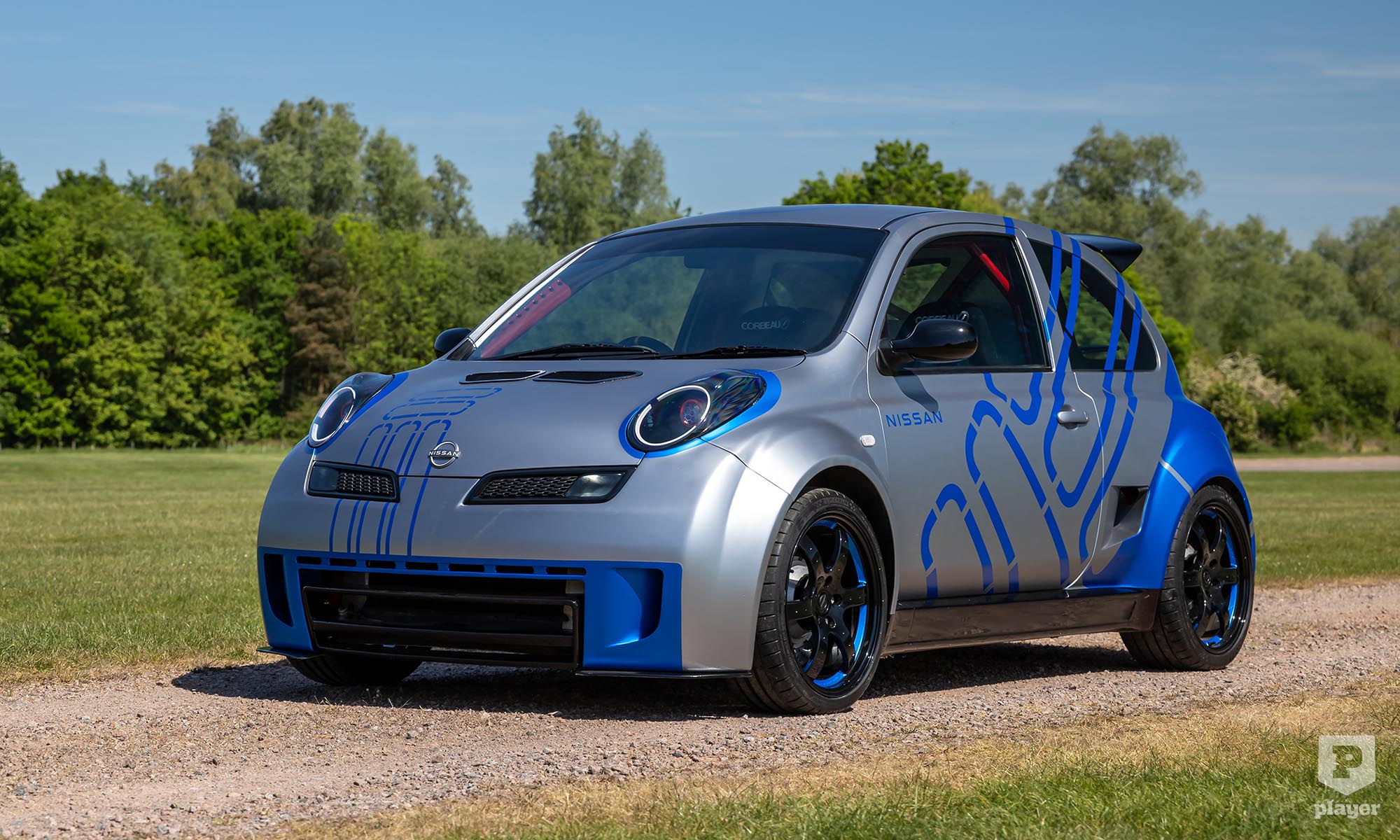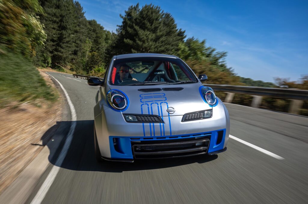 Az eredeti piros-szürke fényezés ezüstnek adta át a helyét, amire a 300ZX hátsó lámpája által ihletett kék minta került. 18 colos Rays kerekeit feketére fényezték, ahogyan a hűtőmaszkot is, és egy kicsit a belsejét is feljavították, például egy 9 colos képernyővel. Az új fényszórók kerek nappali menetfénye pedig már az elektromos Micra dizájnját idézi.