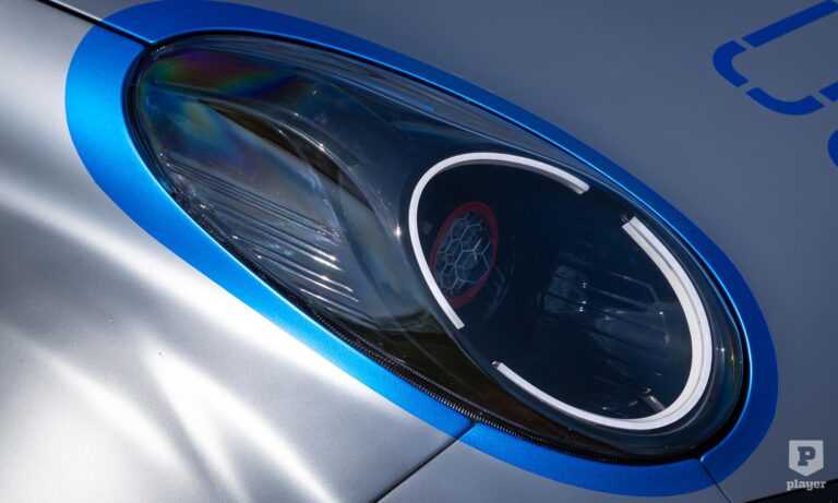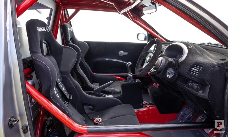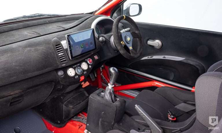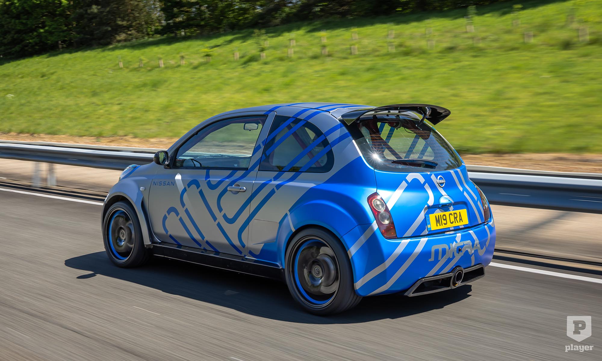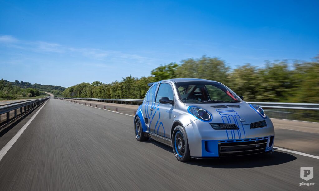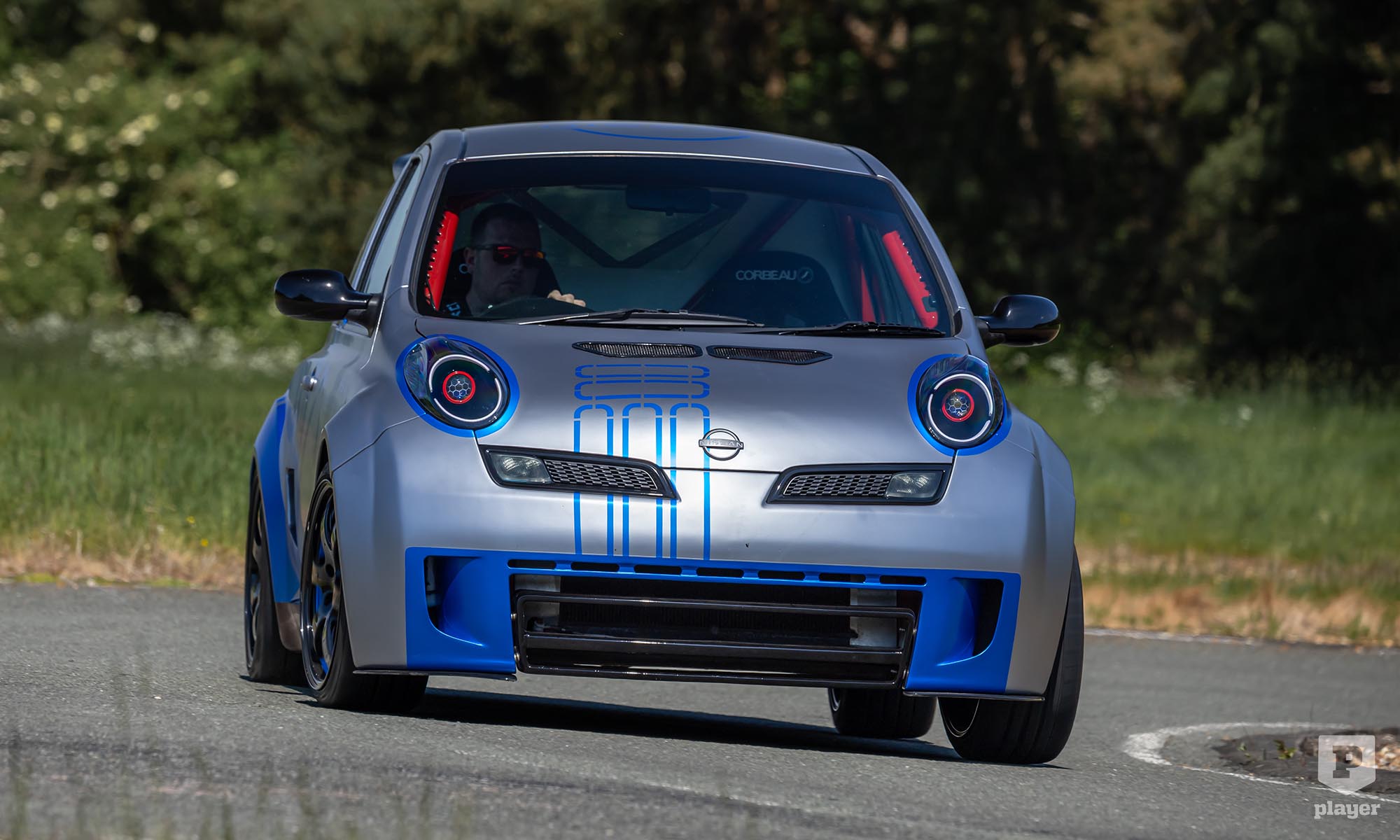 Az eredeti piros-szürke fényezés ezüstnek adta át a helyét, amire a 300ZX hátsó lámpája által ihletett kék minta került. 18 colos Rays kerekeit feketére fényezték, ahogyan a hűtőmaszkot is, és egy kicsit a belsejét is feljavították, például egy 9 colos képernyővel. Az új fényszórók kerek nappali menetfénye pedig már az elektromos Micra dizájnját idézi.