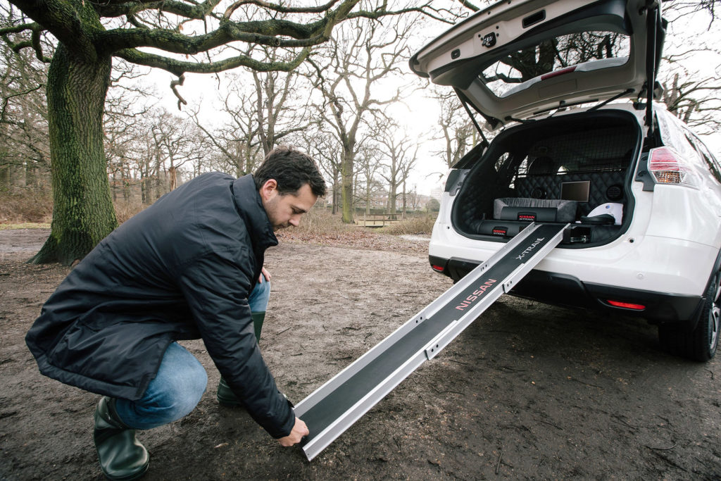 Az X-Trail 4Dogs csomagtartójában kényelmes kuckót alakítottak ki a kutyáknak, a steppelt bőrrel bevont belső könnyen tisztán tartható. A beszállást a kihajtható rámpa könnyíti meg, nem hiányzik a fröccsenés-mentes vizes tálka és a jutalomfalat-adagoló sem. Sőt, ha éppen egy kiadós sarazásból tértetek vissza, beszállás előtt jól jön a kutyazuhany és a beépített kutyaszárító.