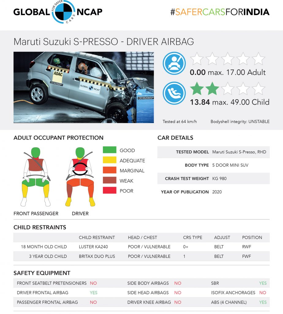 Önmagában súlyos vétség, hogy egy autótípust S-Pressónak hívnak. A Maruti Suzuki, az indiai piac legnagyobb részesedésű gyártója viszont képes volt fokozni ezt: a Global NCAP töréstesztjén az autó ötből nulla csillagot ért el, ennyire képes, pontosabban ennyire nem képes megvédeni vezetőjét.