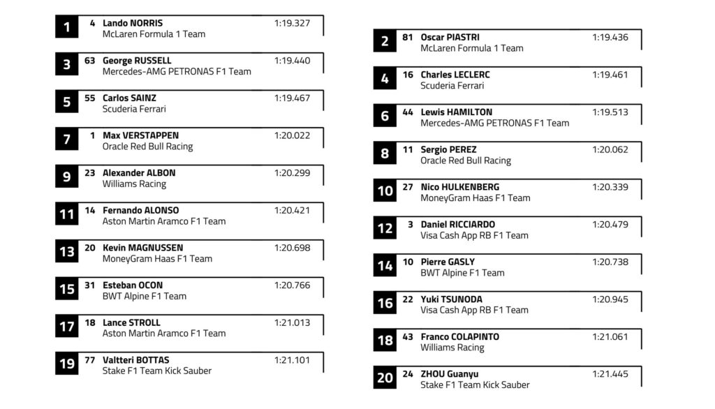 Második helyen Piastri végzett, míg Norris a pole pozícióból indulva, a leggyorsabb kört megfutva pedig a harmadik lett. Bár ez nem rossz eredmény a McLarentől, ugyanakkor a wokingiak ismét nem tudták győzelemre váltani az élről való indulást.