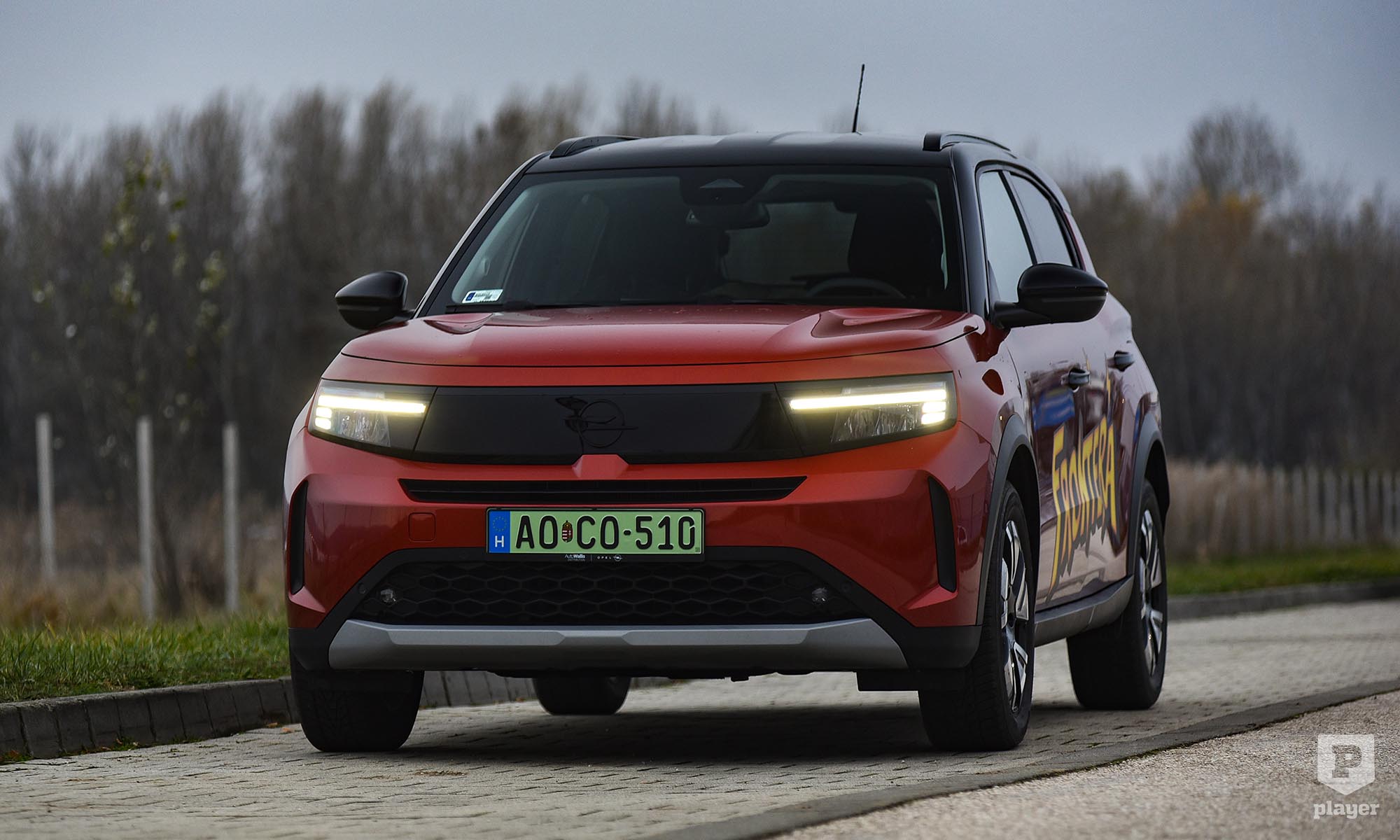 A képregényes betűtípusnak hála mindenkinek nyilvánvaló, hogy ennek a tesztnek is egy Frontera az alanya, a függőleges villámocskákból és a zöld rendszámból pedig tudható, hogy ez a teljesen elektromos Electric változat.