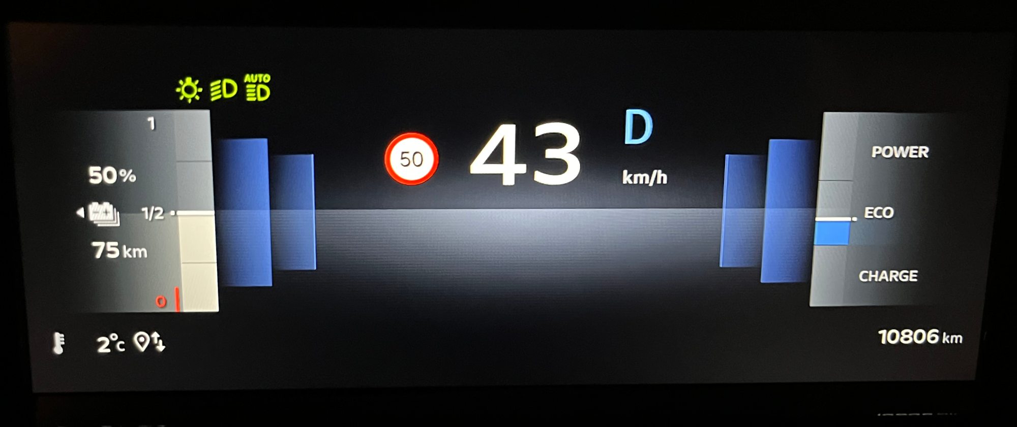 A bal oldali oszlopot kell figyelni: 50%-os töltöttségnél 75 megtehető kilométert jelez az autó kijelzője, ebből bonyolult műveletek nélkül is kiszámolható, hogy akkor a 100% valójában 150 kilométer. A gyári adat fele. Normál vezetési stílussal, nem autópályán, nem túl hidegben, huszonegy-két fokra fűtve az utasteret.