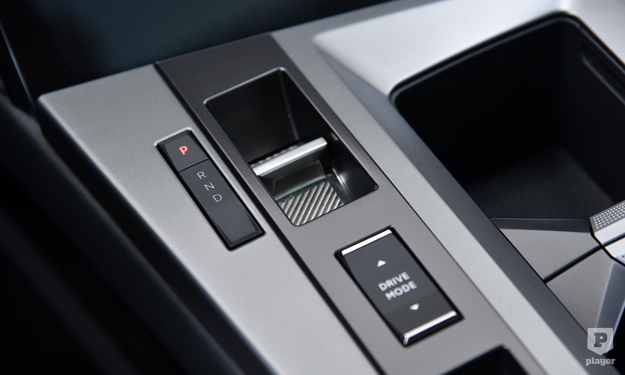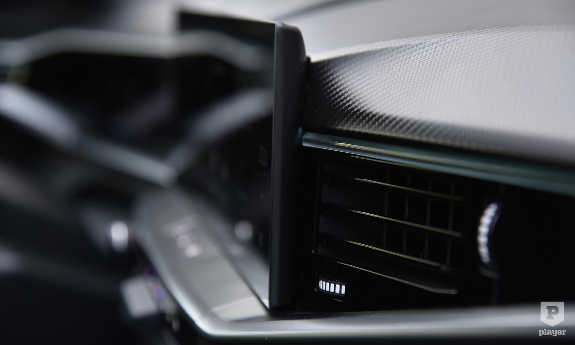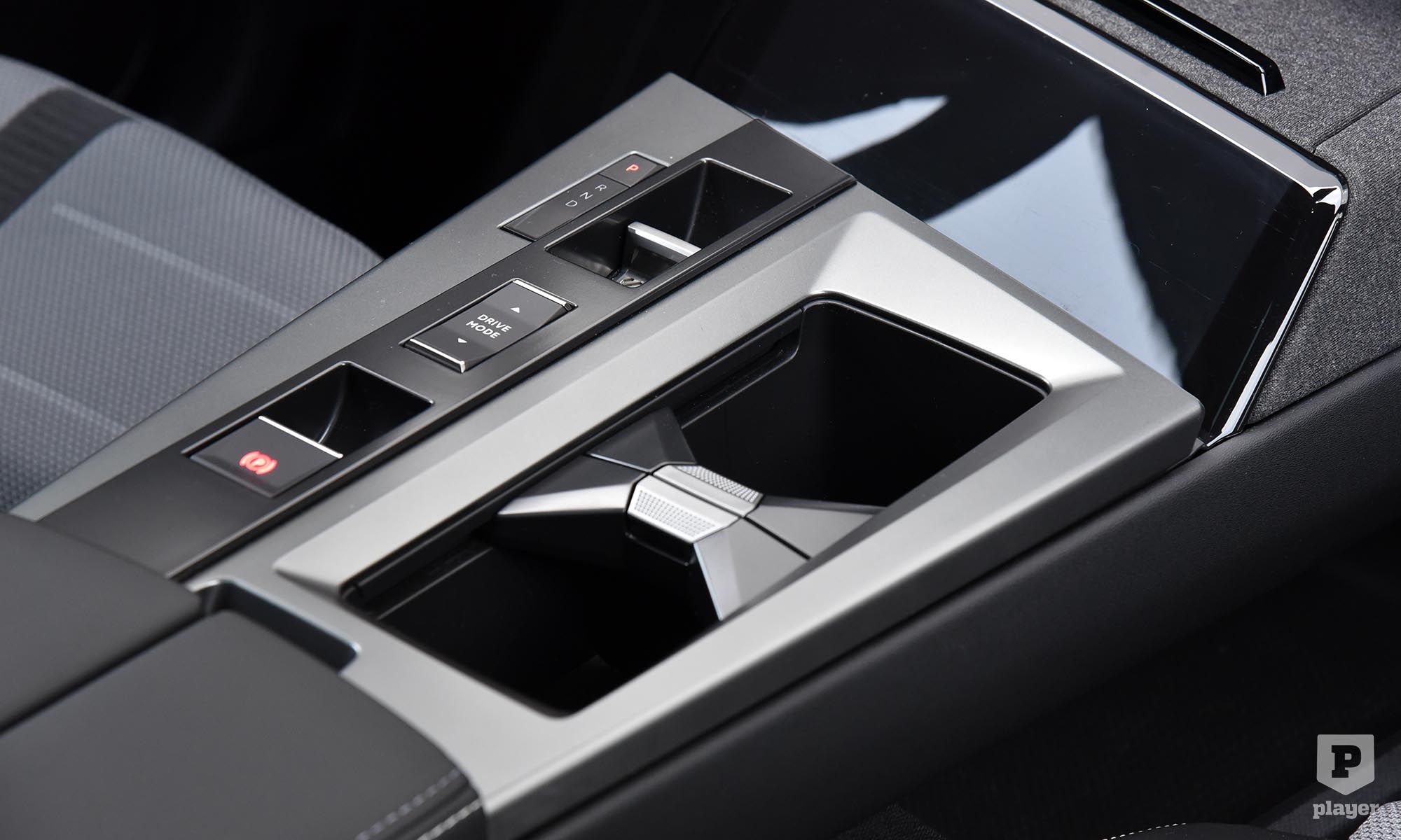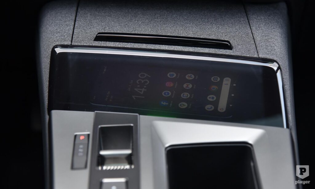 Egyedi az indukciós telefontöltőt rejtő, elhúzható fedeles rekesz, amolyan jó ötletnek tűnt megoldás. Az elv: a telefon nincs elöl, mégis látszódik az áttetsző plexin keresztül, ha felvillan, közben pedig töltődik. A gyakorlat: alig látszik a telefon, nehéz kivenni, a töltő vagy tölti, vagy nem, a ferde plexi pedig pont a vezető szemébe tükrözi a nyitott tetőn beáramló napfényt.