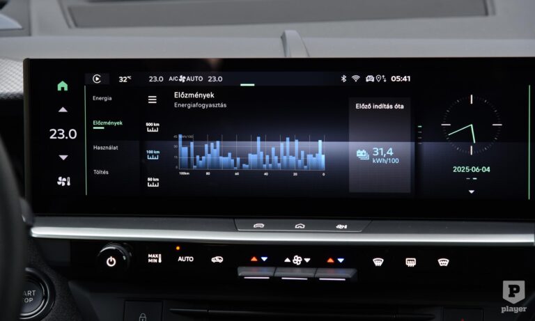 Nagy az autó és viszonylag nagy a tömege, a 17,8–18,5 kWh/100 km WLTP szerinti fogyasztás ehhez képest baráti, kár, hogy a mindennapi élet valahogy másképp adja ki, mint a WLTP mérések, de nem autópályán közlekedve 20 körüli értékkel számolhatunk, a gyári 564–582 kilométer hatótáv helyett bő négyszázzal, ami messze nem rendkívüli, de az esetek nagy százalékában bőven elegendő. Ha tölteni kell, és van egy 100 kilowattos a közelben, 20-ról 80 százalékra 29 perc alatt telik meg az aksi.