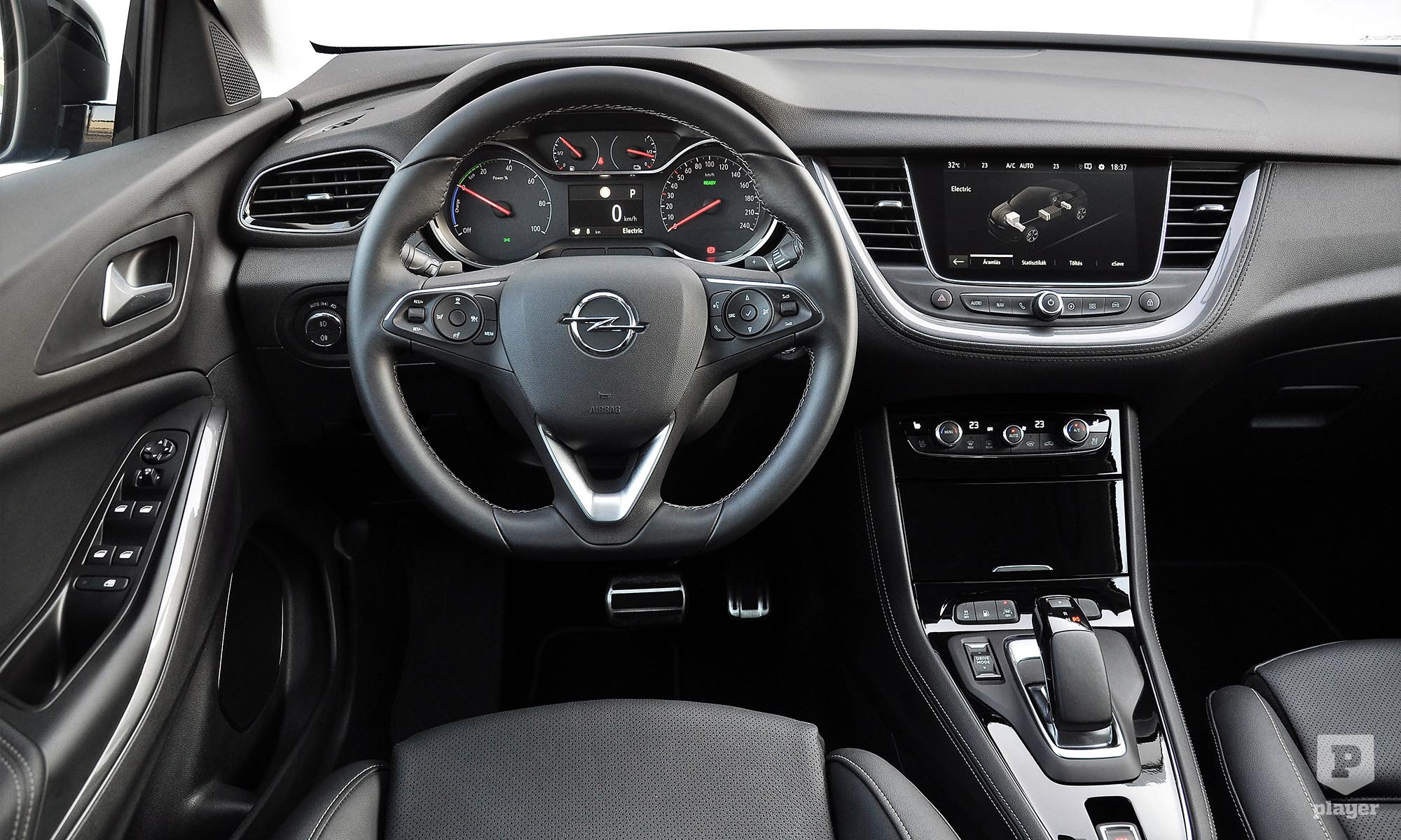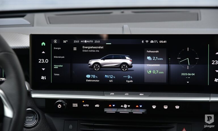 Ha jóindulatúak vagyunk – lehetünk azok, a Grandland szimpatikus jármű –, mondhatjuk hatótávnövelő megoldásnak, hogy ez az Opel egyáltalán nem csábít amperfaló gyorsítgatásokra és felesleges vadulásra, a nyugodt vezetés illik a karakteréhez, ami nem külső sávban gurulást jelent, hanem normális tempót. Kényelmes a futóműve, a villanymotoros csendet nem zavarja meg szélzaj, és a GS szint felszereltségi listája elég hosszú, bár például az automata csomagtérnyitás és a tíz hangszórós prémium Focal hifi további 480 ezer forintba kerül, a bőrkárpit hűthető és masszírozós első AGR ülésekkel 950 ezer forintos tétel.
