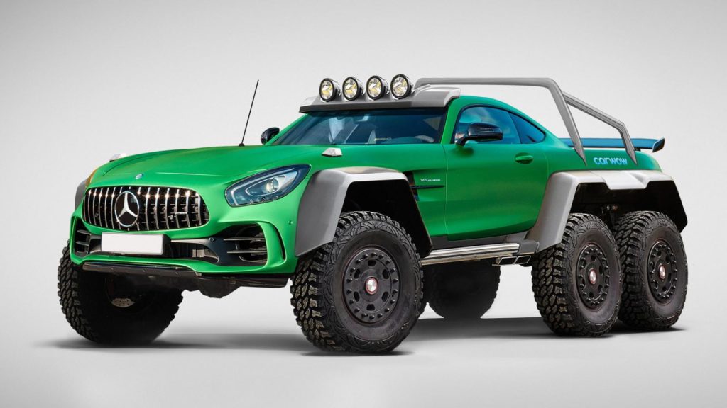 Döbbenetes megjelenésével már a Mercedes-AMG G63 6x6 is helyet kaphatna ebben az összeállításban, mint egy G-osztály és egy harckocsi keveréke, de a grafikus tovább ment, és az AMG GT karosszériájával álmodta meg a hatkerekű szörnyet. Megnyerő, nem?