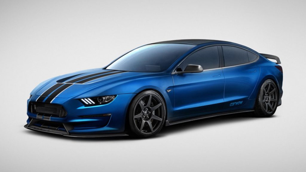 Két amerikai ikon ötvözetét látod magad előtt, és mi sem gondoltuk volna, hogy az elektromos hajtású Tesla Model 3 mennyivel jobban mutatna a Ford Mustang GT 350R agresszív frontrészével. A gépházteteje úgy domborodik, mintha V8-as lenne alatta, pedig igazából ott is csomagtartója van.