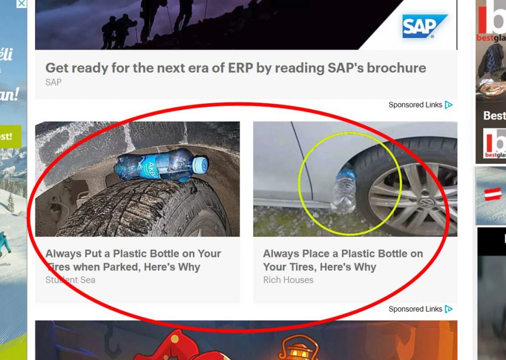 „Ezért tegyél egy műanyag palackot a kocsid kerekére” – ezzel a szöveggel jött szembe velem mindenféle autós témájú cikkeknél már többször is egy tipikus szöveges-képes cikkajánló a neten. Aztán egyszer, amikor egy cikk alatt már nem is egy, hanem két példányban kaptam meg, más-más képpel és enyhén eltérő szöveggel ugyanezt a reklámot, nem bírtam ki, és rákattintottam az egyikre.