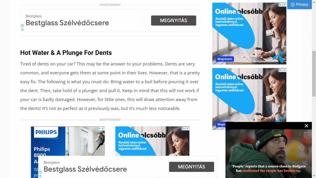 Kattintom sorra a jótanácsokat. Megtudom, hogy ha télen nejlonzacskót gumizok a külső tükörre, nem fagy le a tükörlap, és így azt az időt, amit a tükör lehúzásával töltenék a jégkaparóval, arra fordíthatom, hogy leszedem a tükörről a gumit és a zacskót. Az is kiderül, hogy ha macskaalommal töltött zoknit teszek a szélvédő alá, nem párásodik be az üveg menet közben. Állítólag. Meg hogy ha van egy horpadás az ajtón, egy vécépumpával és egy kis forró vízzel ki tudom egyengetni. Nagyjából. Talán. De még mindig semmi a PET-palackról, ami miatt kattintottam. Csak az egybekezdéses aloldalak, és a sok-sok-sok reklám: