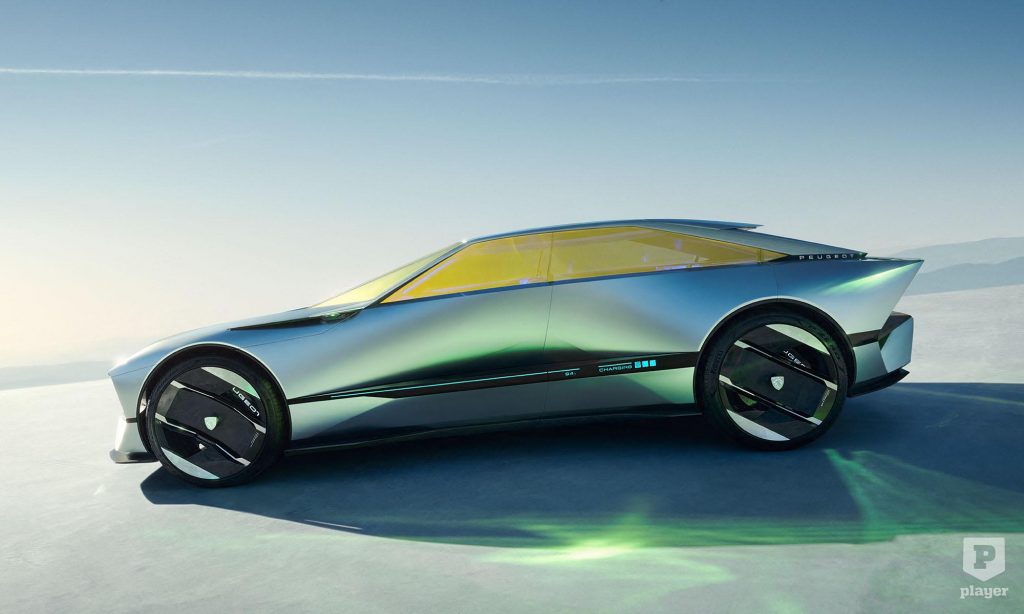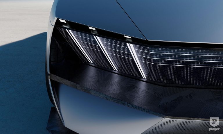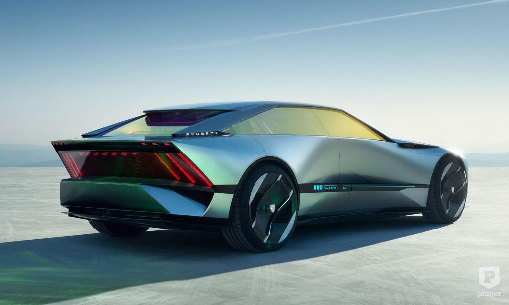 A Peugeot-embléma két oldalán futó vízszintes sávok a 205, 405 és 605 modellek hűtőmaszkját eleveníti fel, míg a fényszórók befelé döntött felső vonala az 504 és 505 megoldására utal. Jövőbe mutat a karosszéria oldalán lévő kijelző, ami a töltöttségről tájékoztat, a 20 colos kerekek közepén pedig mindig függőlegesen áll az embléma.
