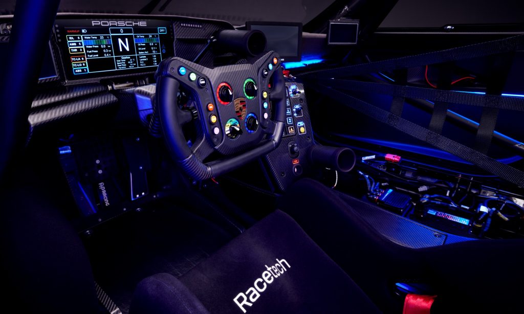 Gombokkal megszórt kormány, kagylóülések és bukócső van a 911 GT3 R rennsportban, de még hagyományos külső tükre sincs, csak digitális.